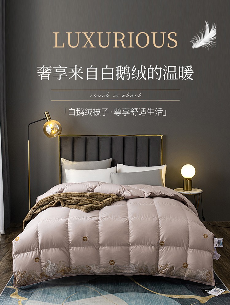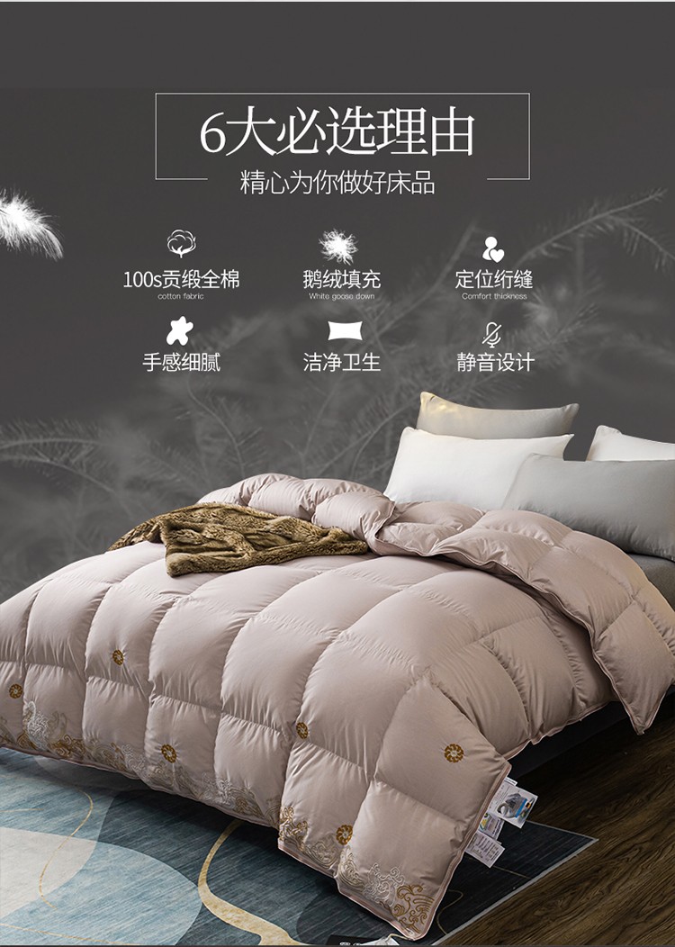 商品名称:俏企鹅 2025新款绣花款-100s贡缎全棉白鹅绒被 粉咖