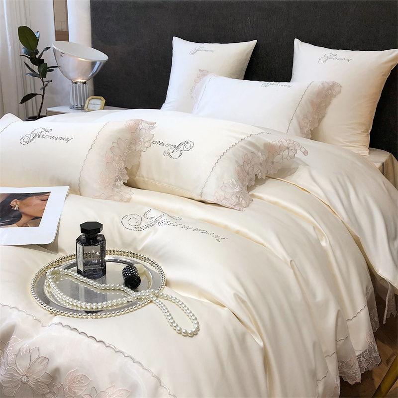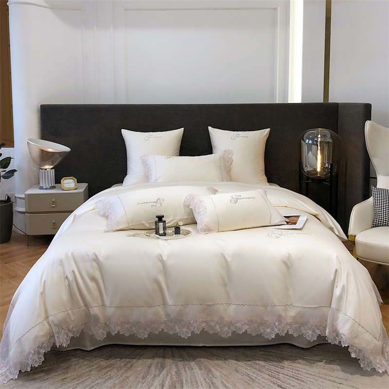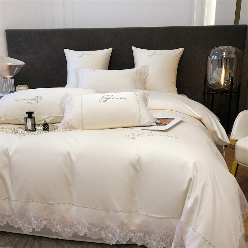 商品名称:曼布缇法式高定100s长绒棉进口欧根纱绣花蕾丝四件套 温柔时光-奶芋白