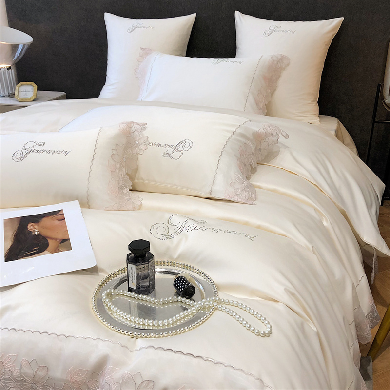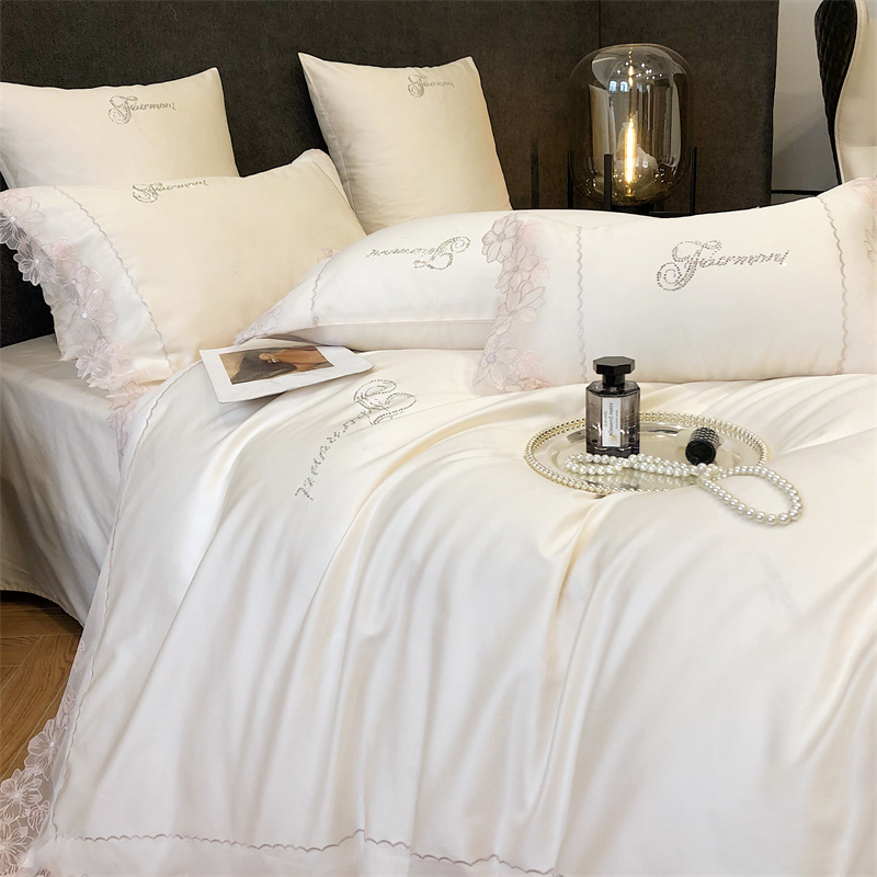 曼布缇法式高定100s长绒棉进口欧根纱绣花蕾丝四件套 温柔时光-奶芋白