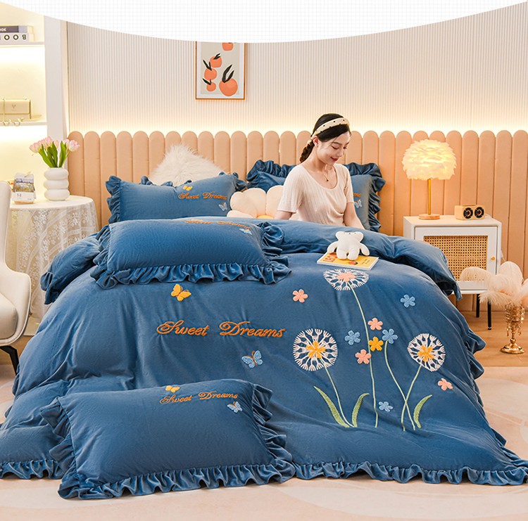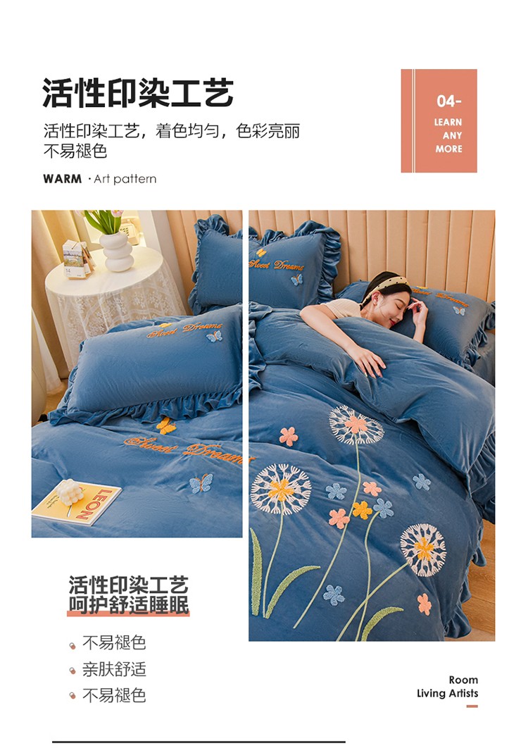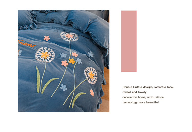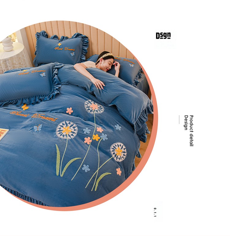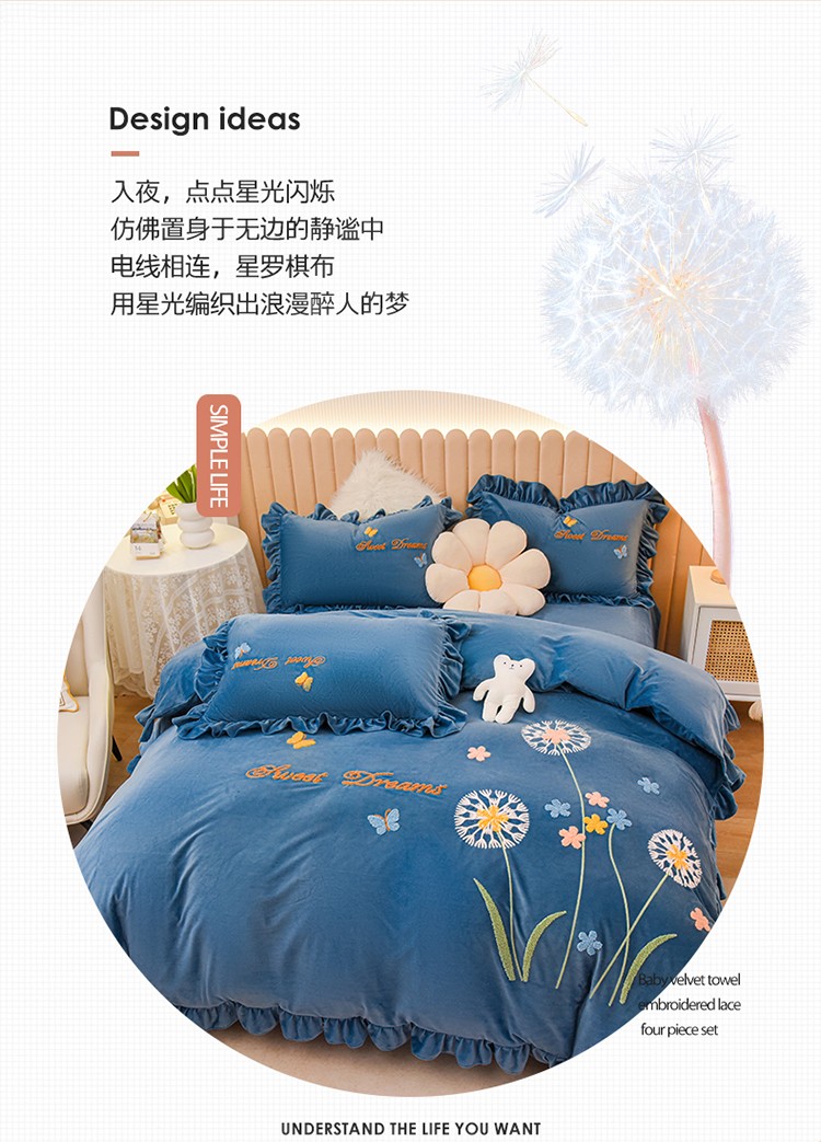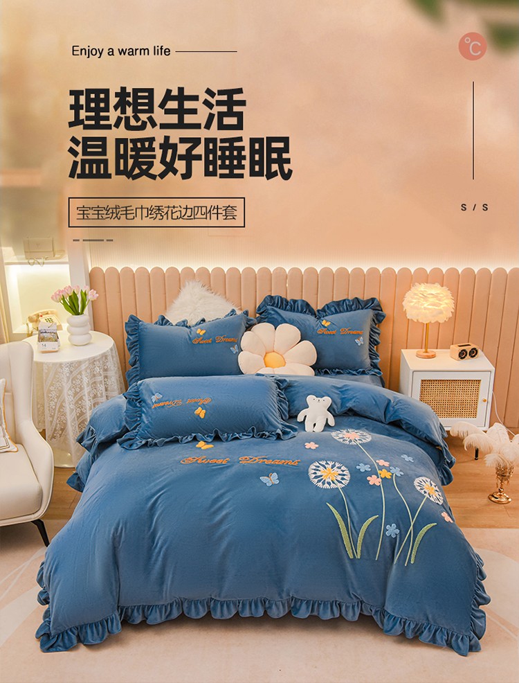 商品名称:唐人居 2025新款宝宝绒毛巾绣花边四件套-蒲公英之恋-蓝