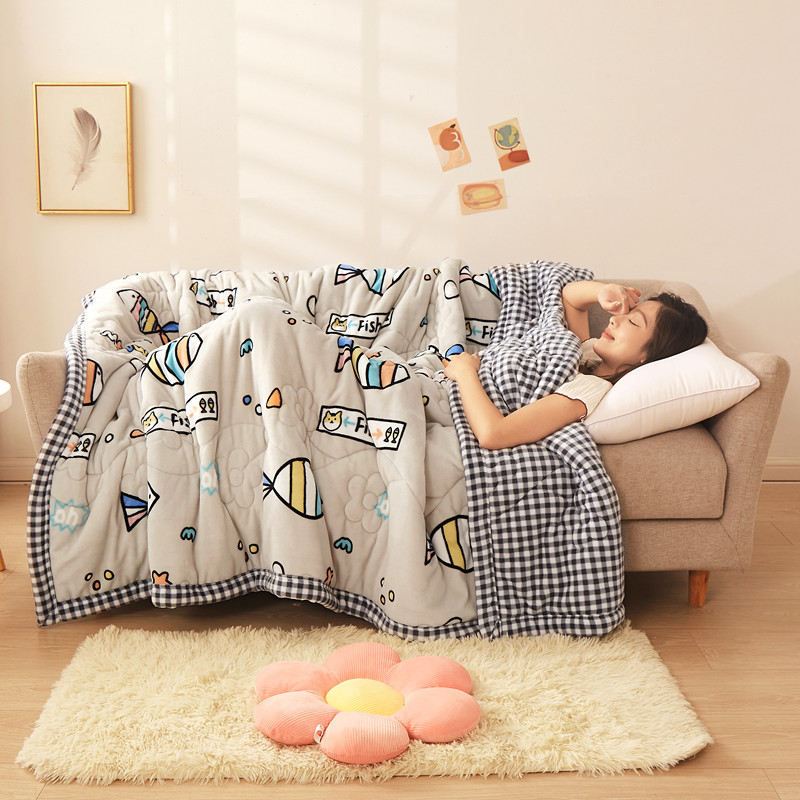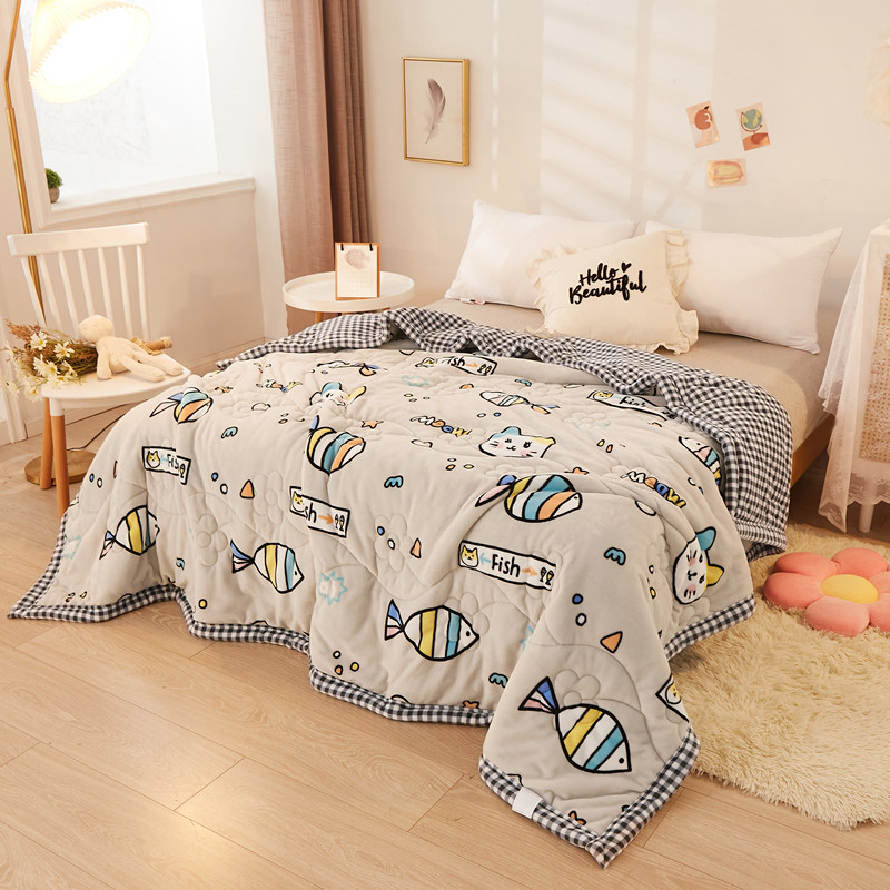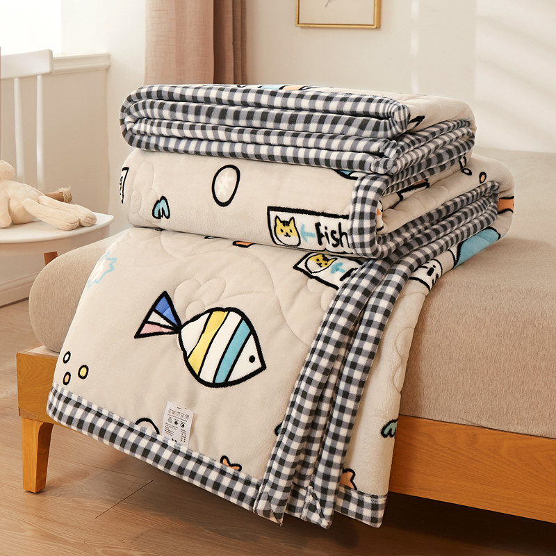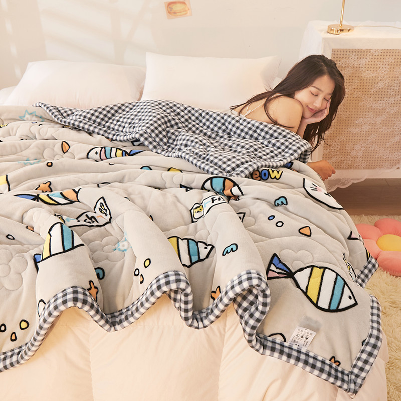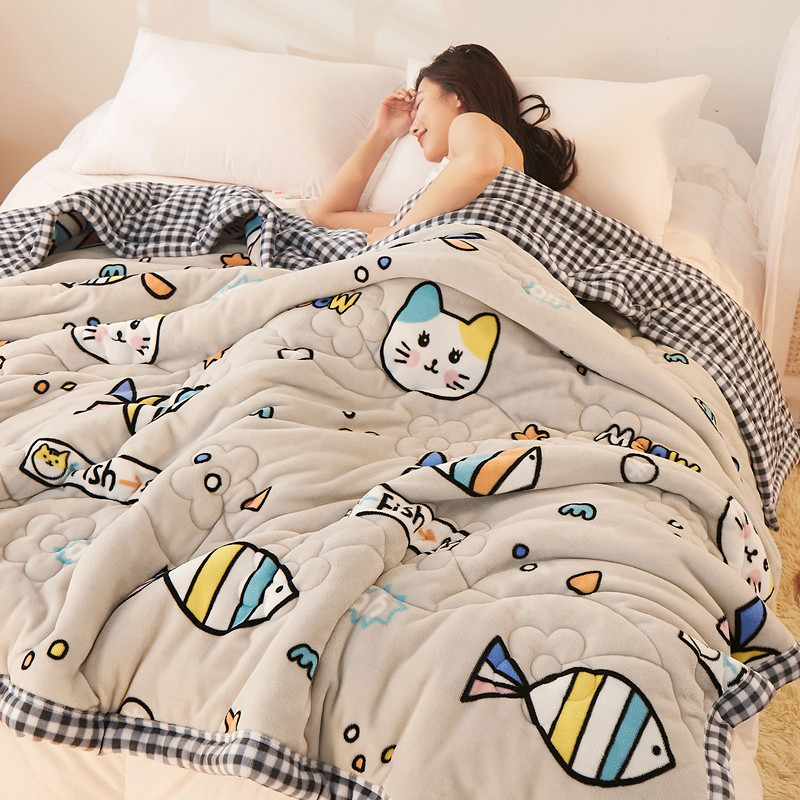 苏拉 2023新款牛奶绒夹棉绗绣三层毯 小猫鱼