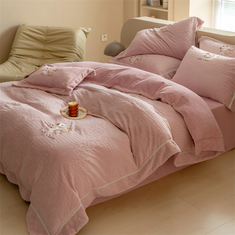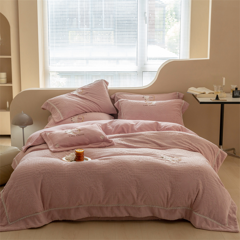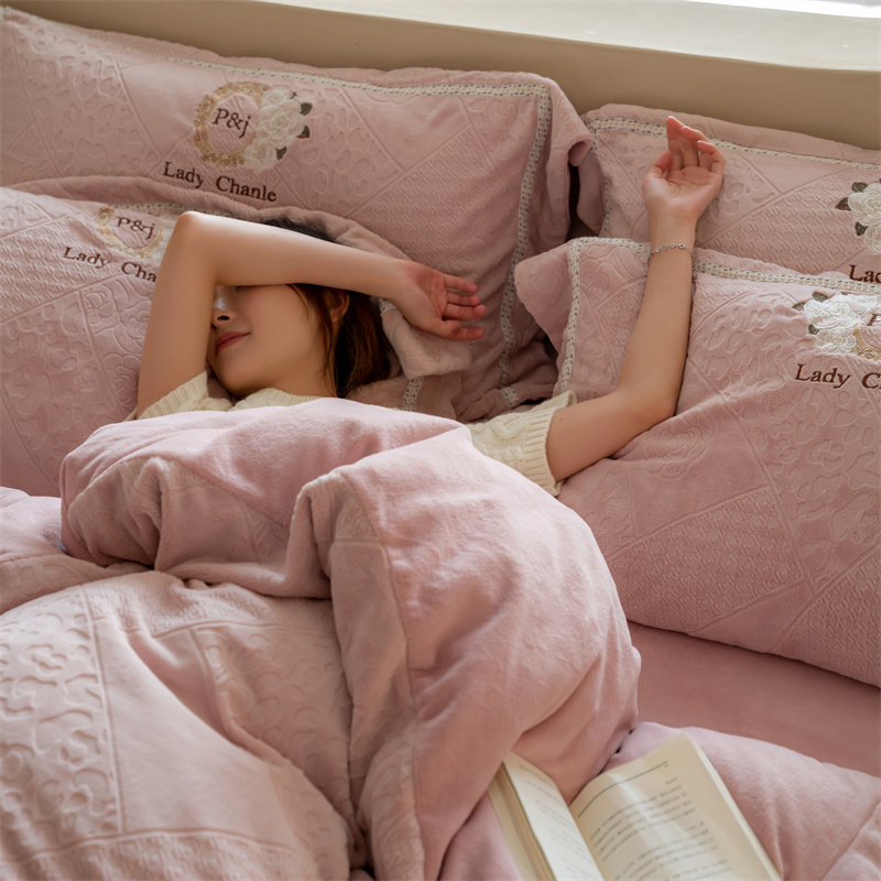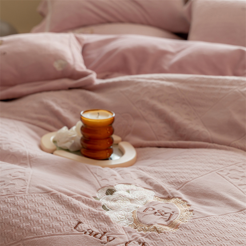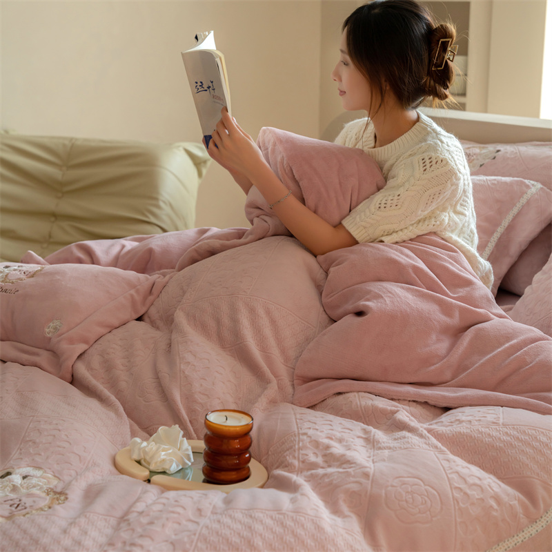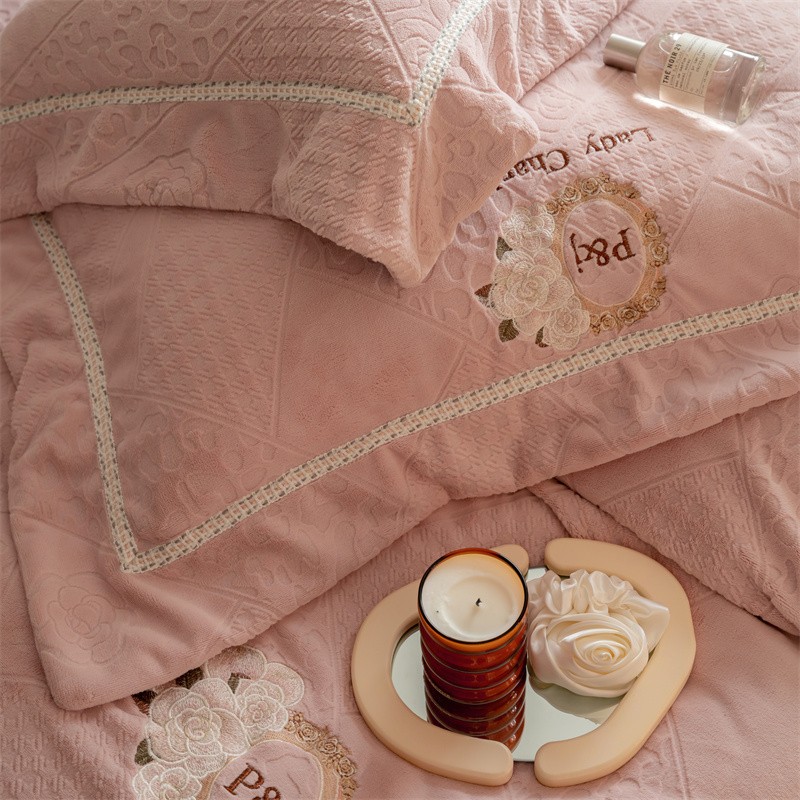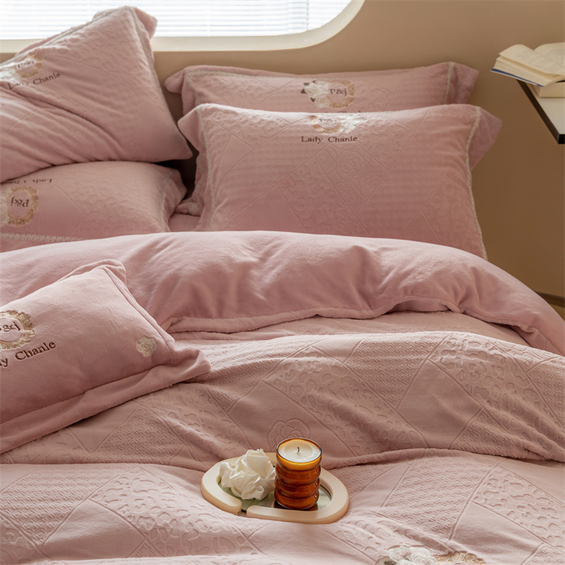 馨蕊家居 2022新款秋冬刺绣轻奢煦暖绒四件套-莫奈场景二 莫奈-蔷薇粉