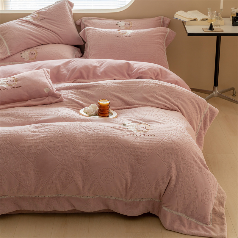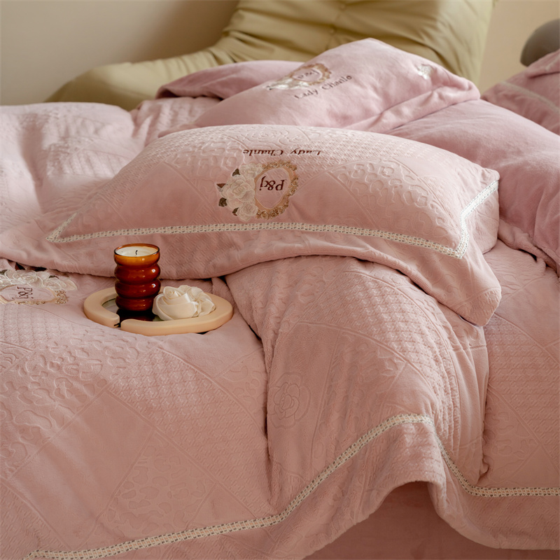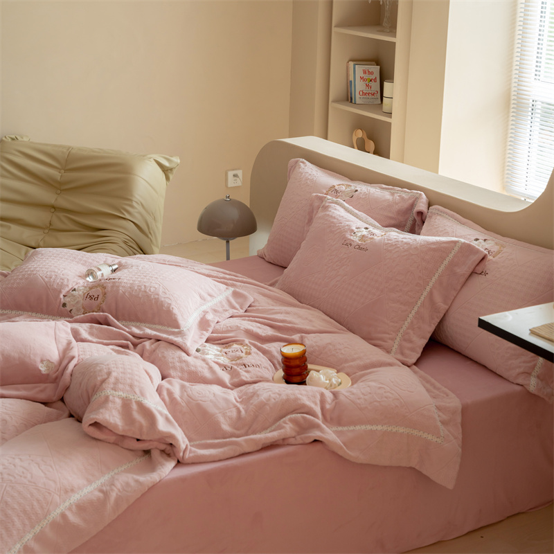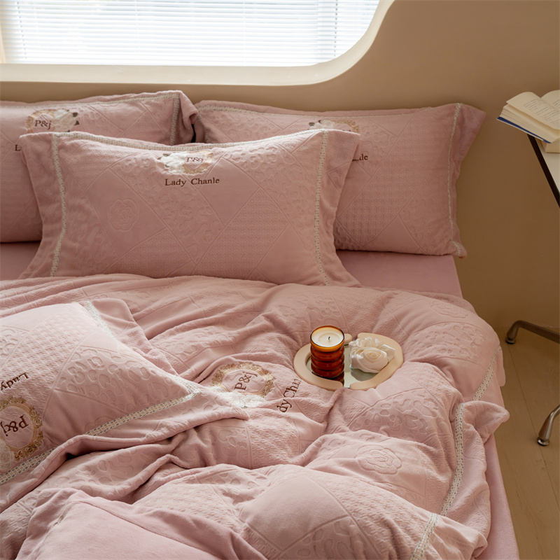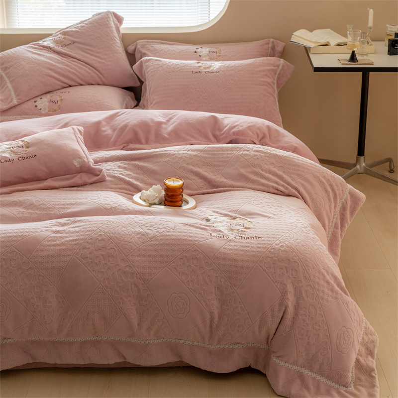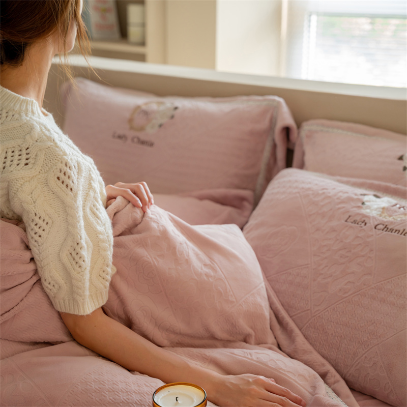 馨蕊家居 2022新款秋冬刺绣轻奢煦暖绒四件套-莫奈场景二 莫奈-蔷薇粉