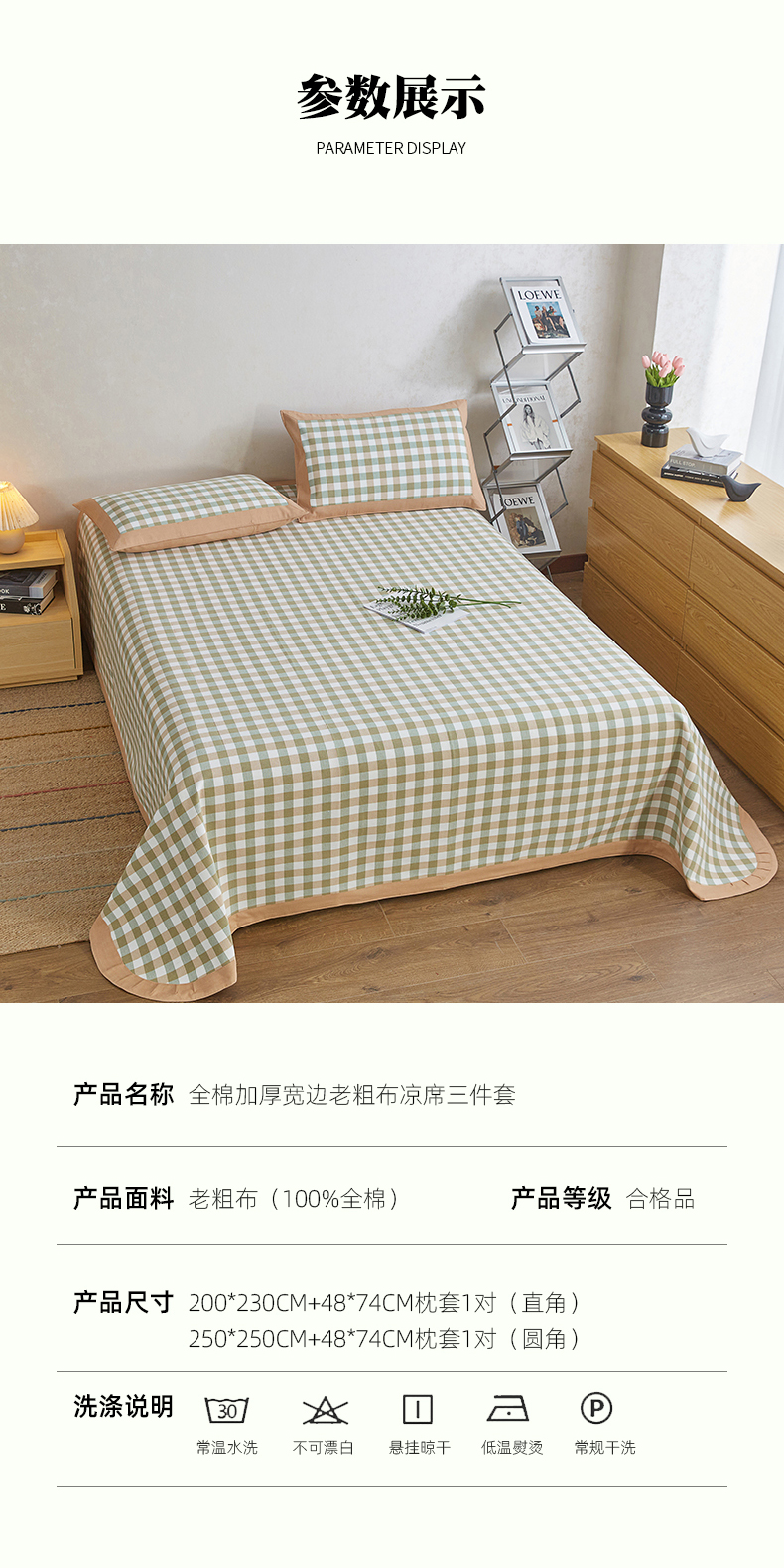 商品名称:(总)首爱 2025新款全棉加厚宽边老粗布凉席三件套