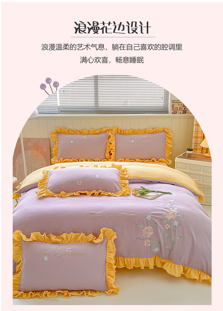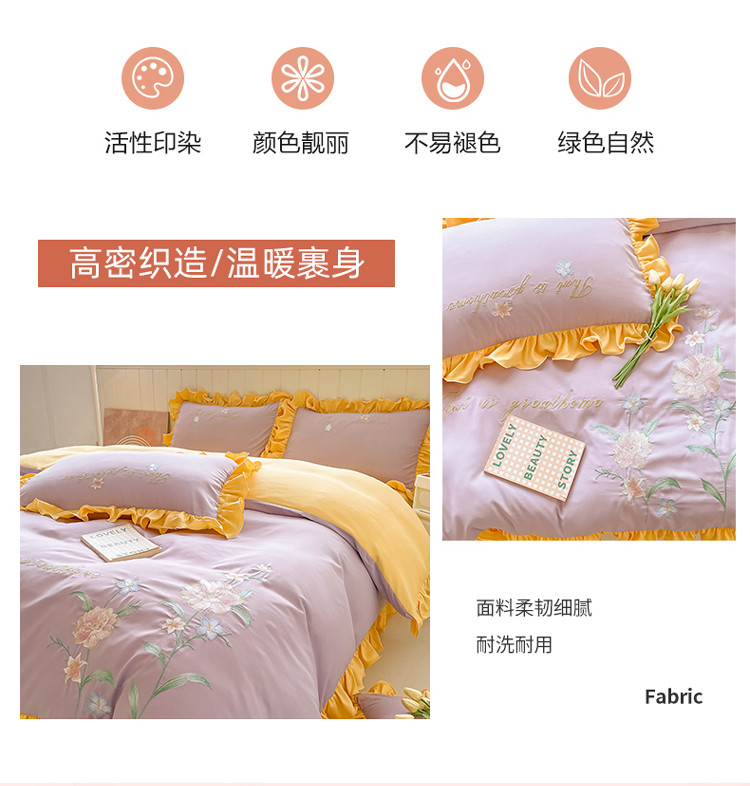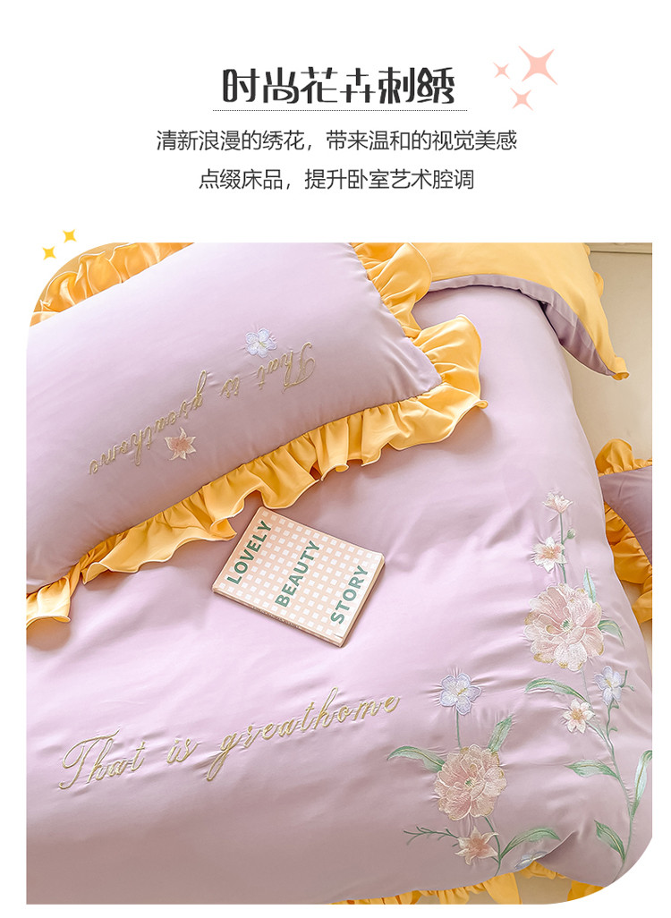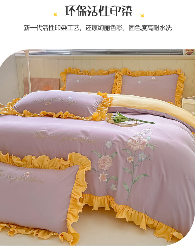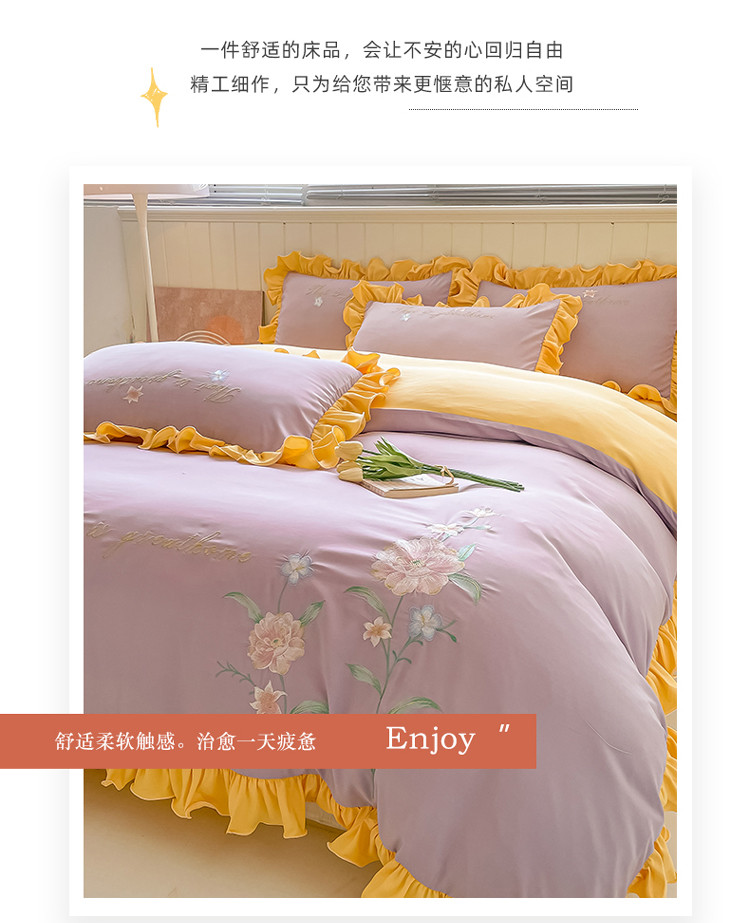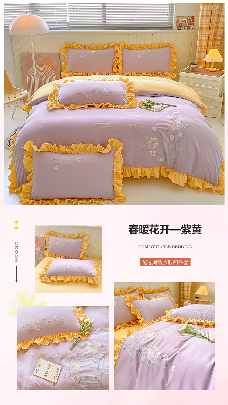 富盛 2024新款水洗亲肤棉刺绣四件套公主风四件套-春暖花开 紫黄