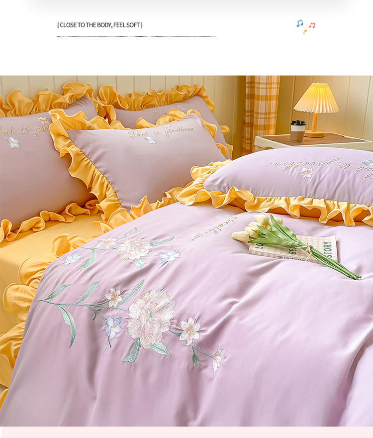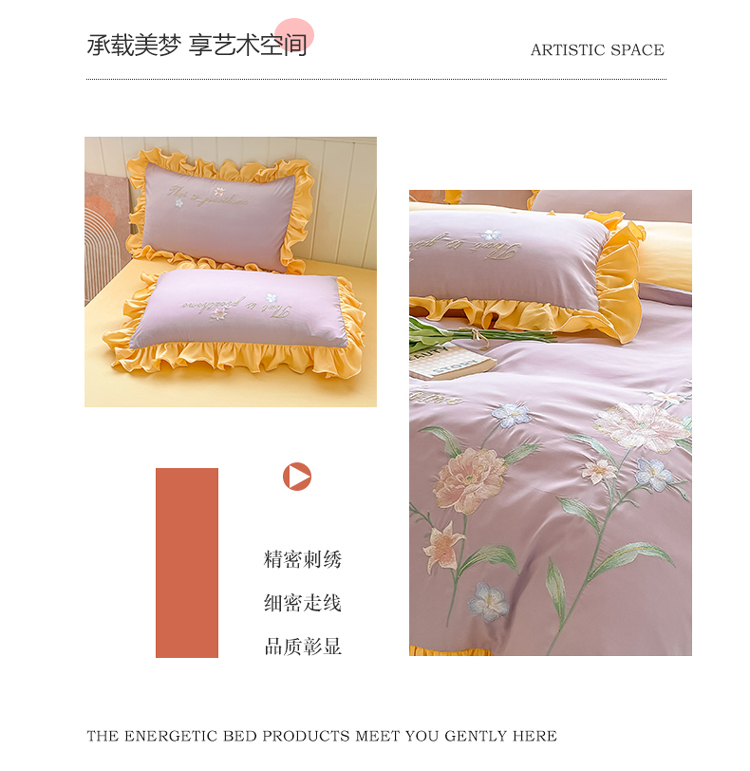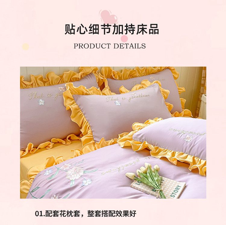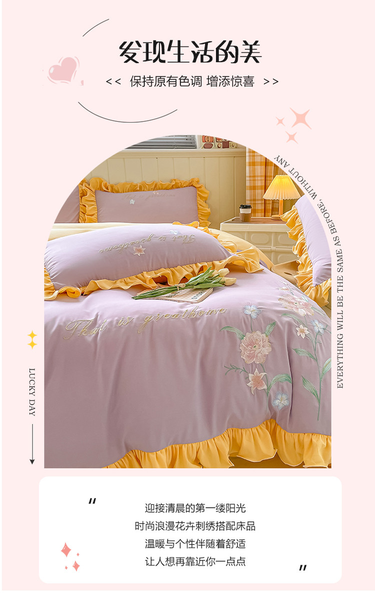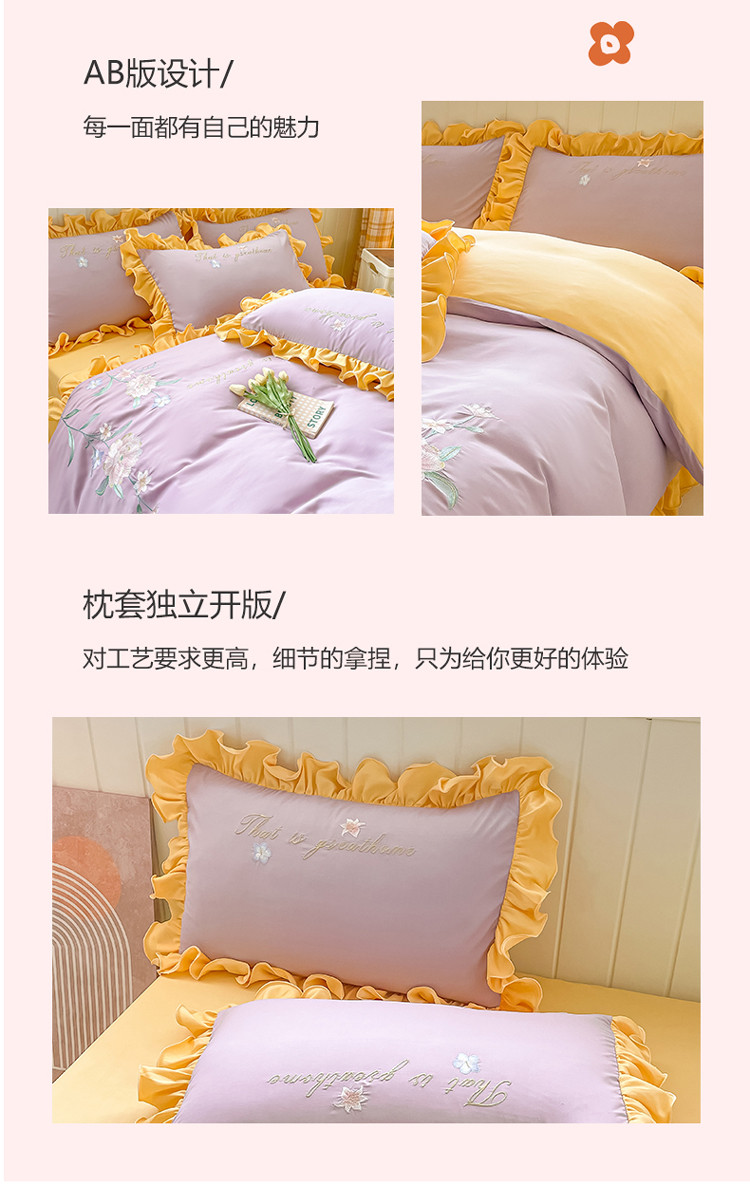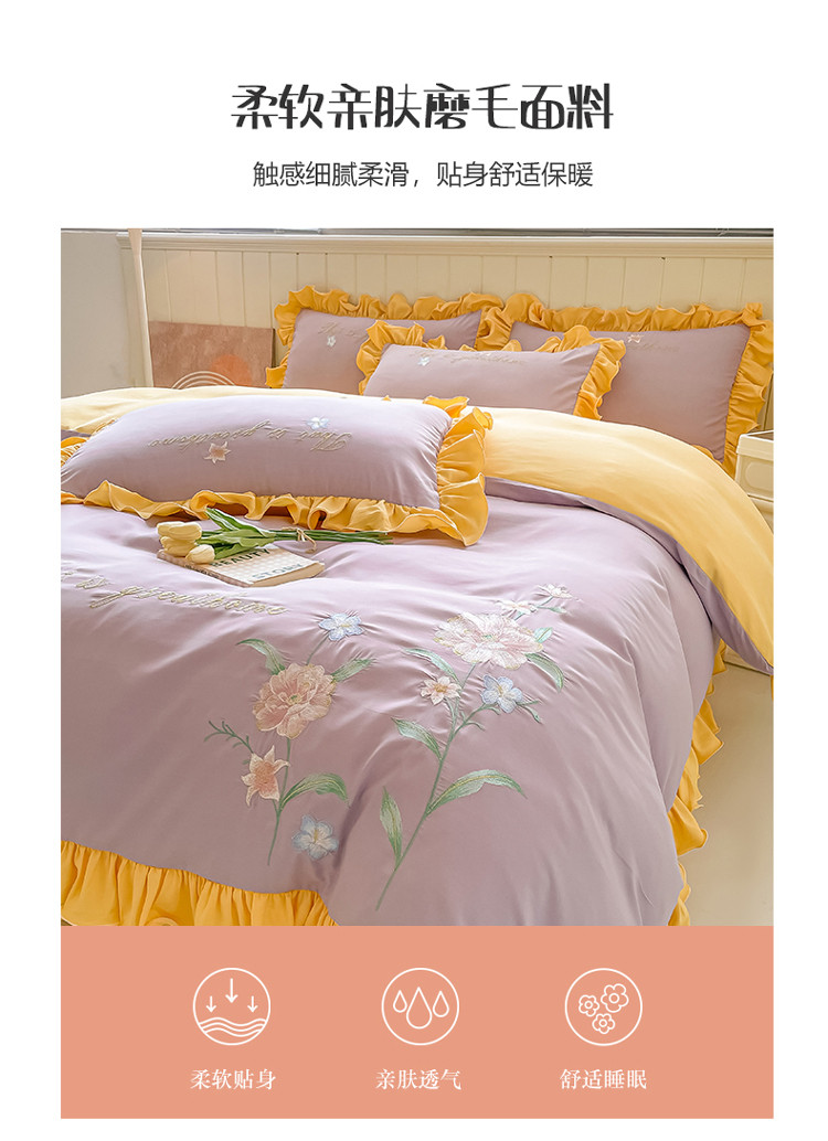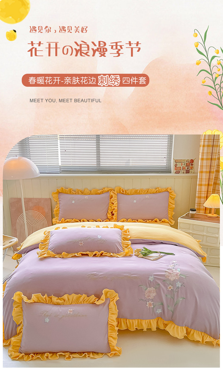 富盛 2024新款水洗亲肤棉刺绣四件套公主风四件套-春暖花开 紫黄