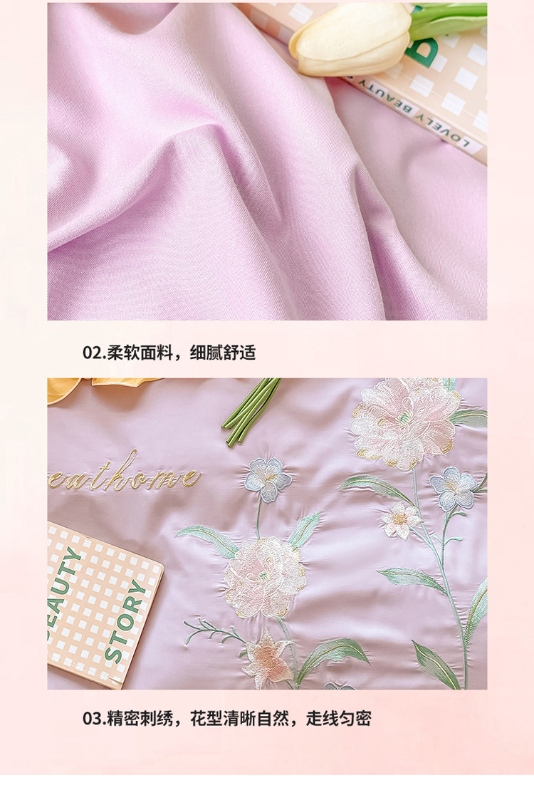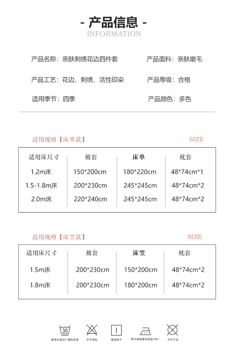 (总)富盛 2024新款水洗亲肤棉刺绣公主风四件套-春暖花开,浅绿+深绿,紫黄,浅绿,粉玉,白粉,粉绿,黄蓝,大红