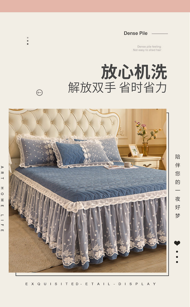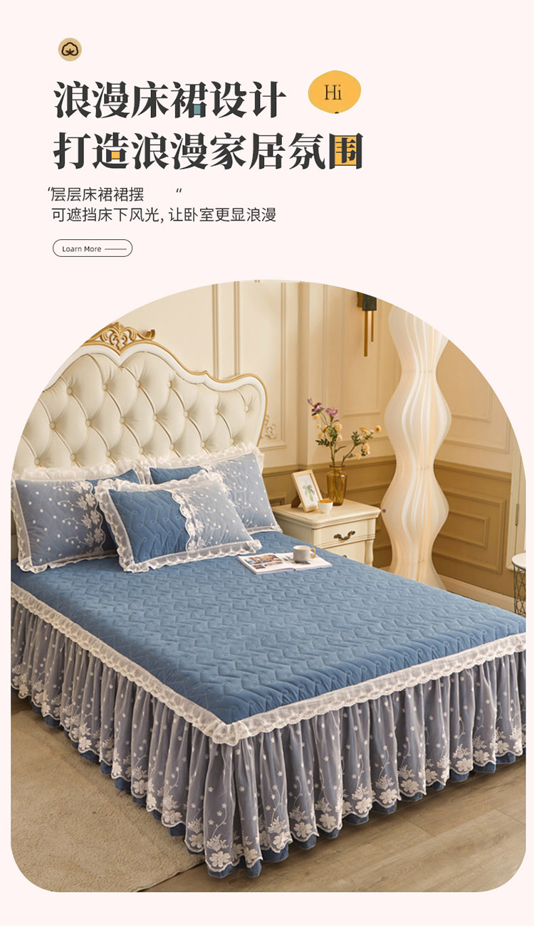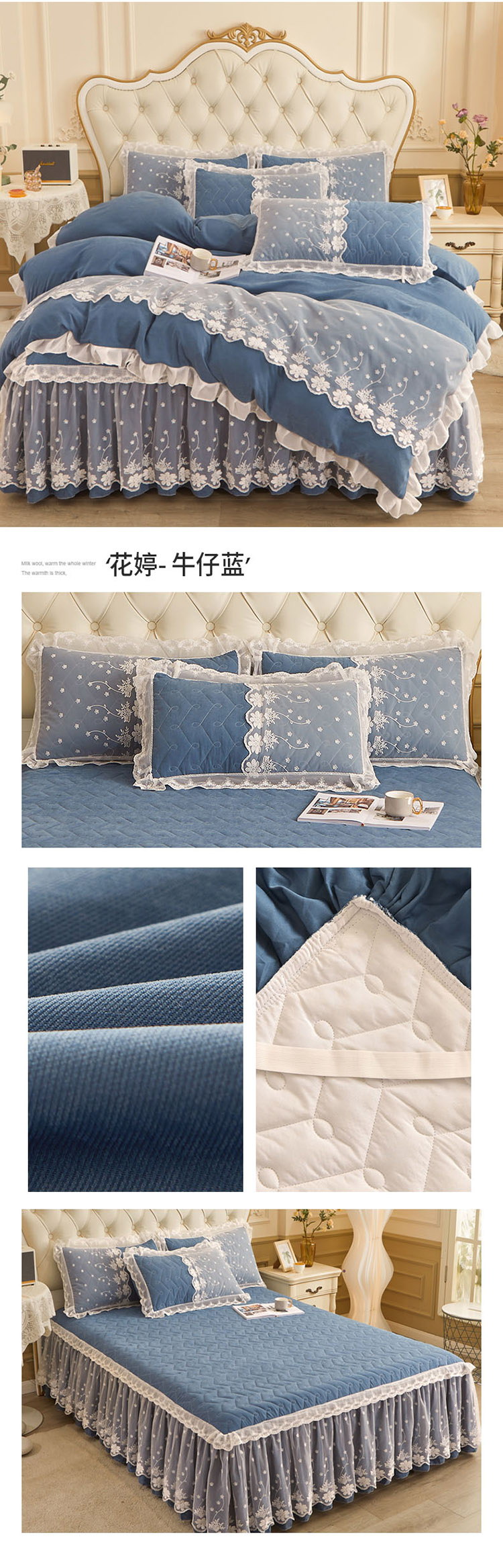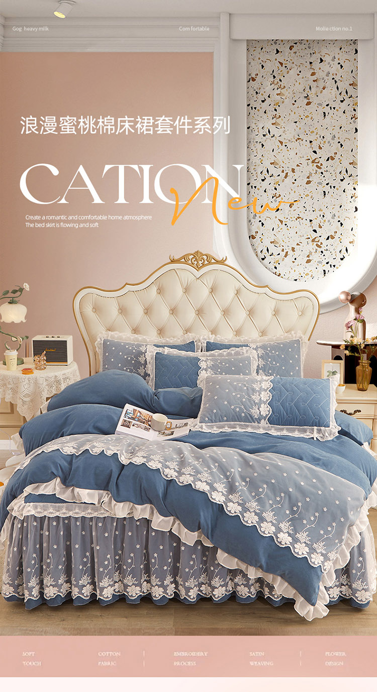 当前位置: 91家纺网 > 商品网购 > 床品套件 > 四件套 > 全棉普通四件套 > 恋尚 2023新款蜜桃棉夹棉床裙款四件套 花婷- 牛仔蓝
