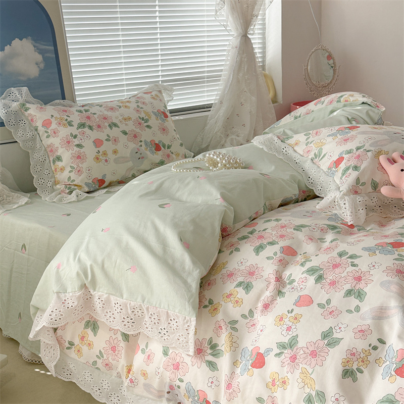 昔可家纺 2023新款全棉四件套公主蕾丝花边ok 草莓小兔
