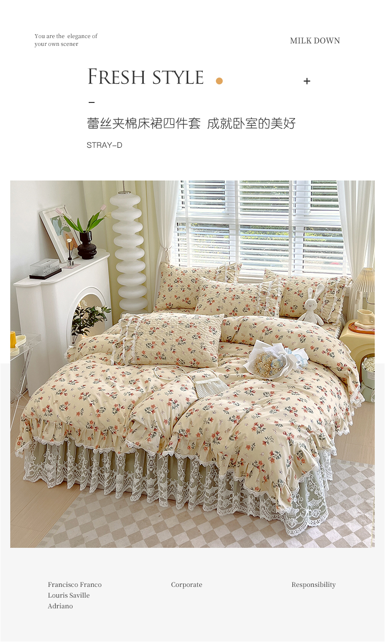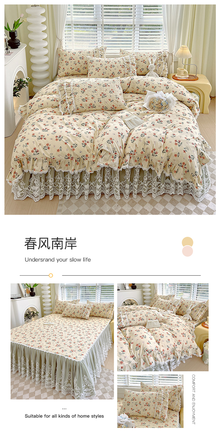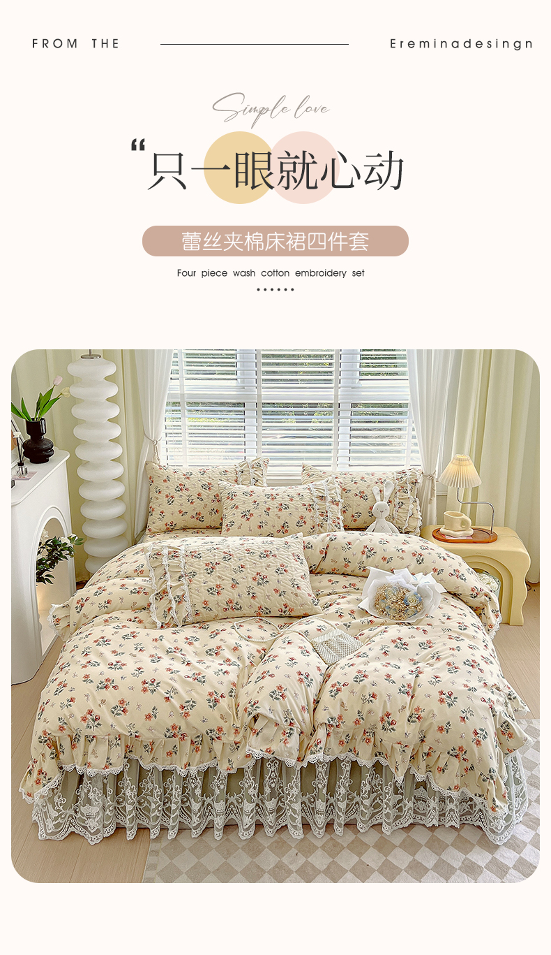 当前位置: 91家纺网 > 商品网购 > 床品套件 > 四件套 > 化纤普通四件套 > 罗艺轩 2024新款法式风蕾丝夹棉床裙款四件套 花想容-春风南岸