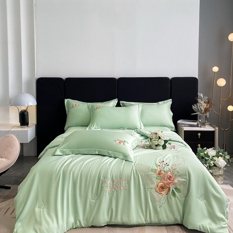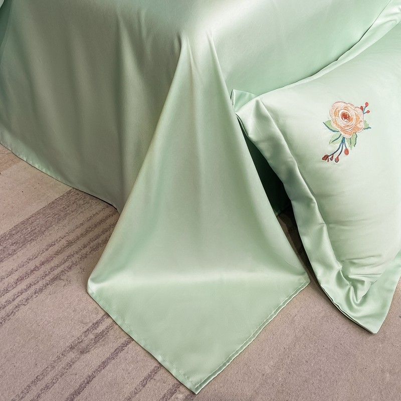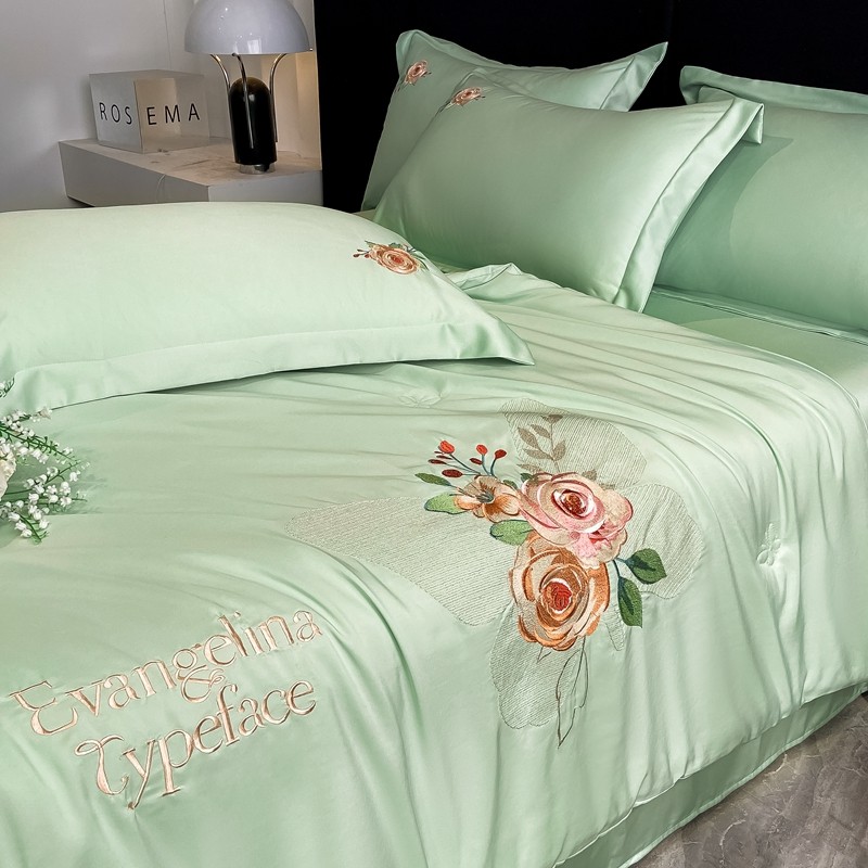 商品名称:伊人居 2024新款轻奢系列刺绣水洗真丝夏被四件套 蝶恋花-清爽绿