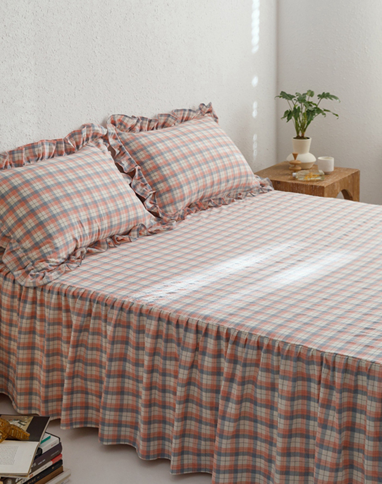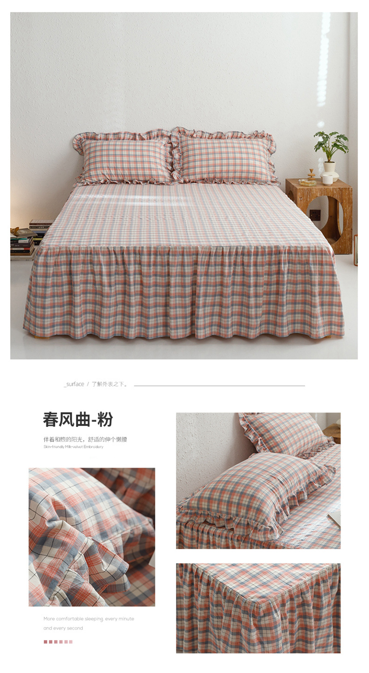 忘忧草 2023新款全棉色织水洗棉床裙纯棉格子 春风曲-粉