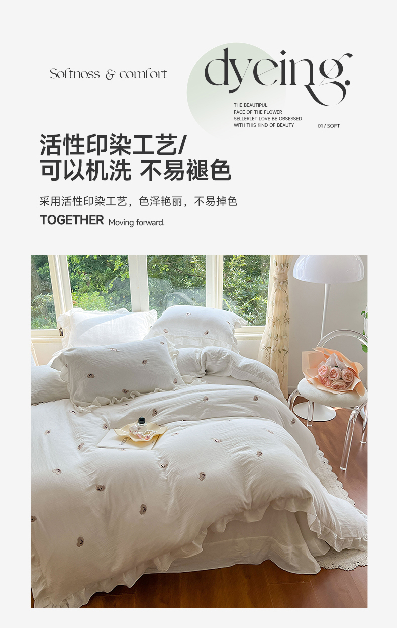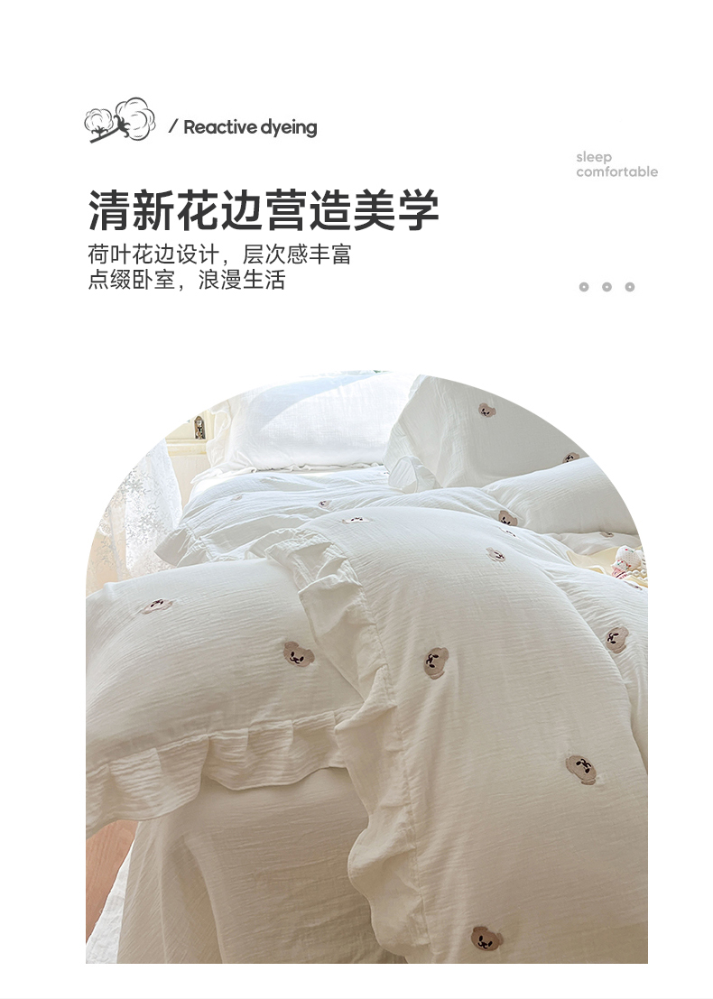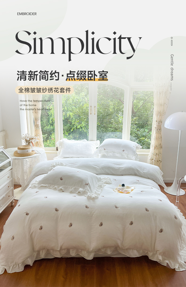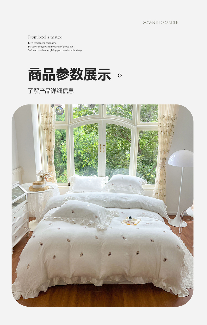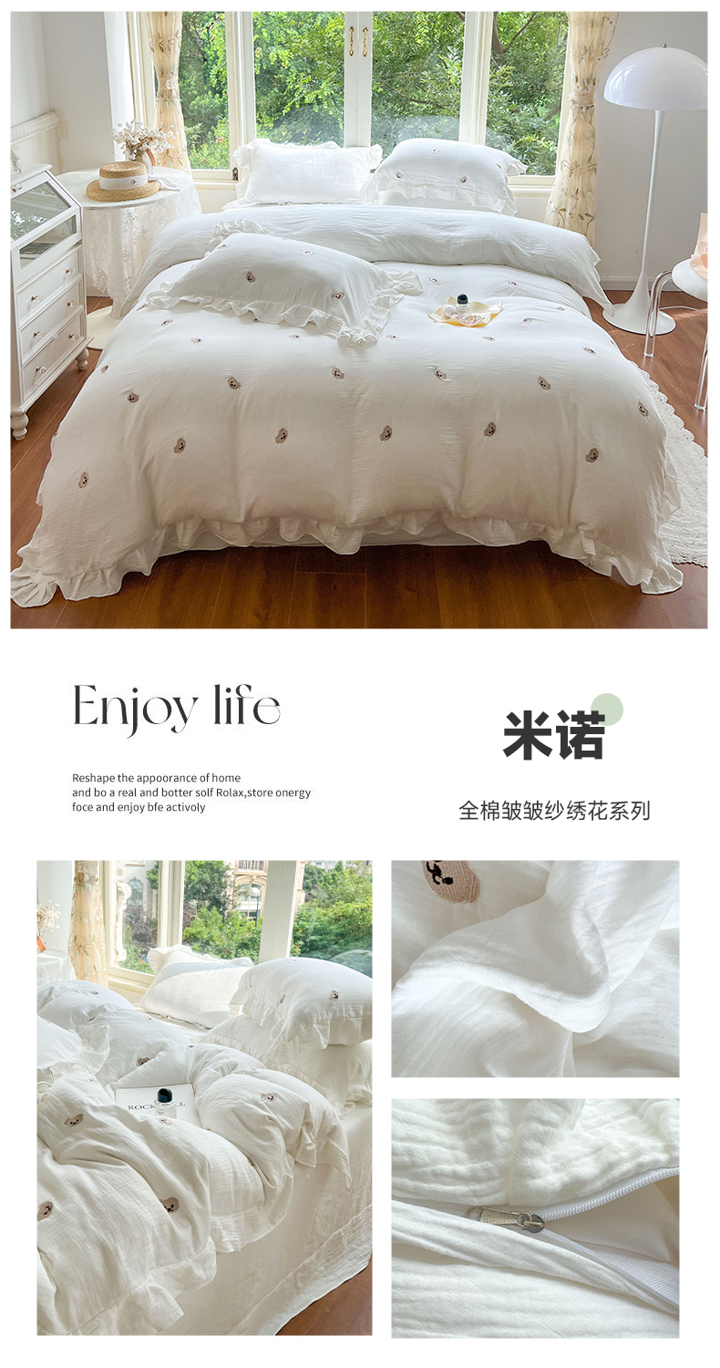商品名称:木楌家居 2024秋冬全棉皱皱纱荷叶边刺绣工艺款四件套 米诺