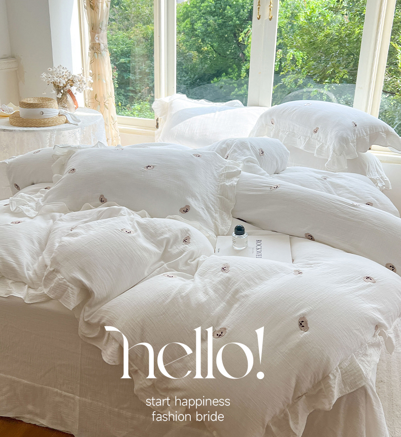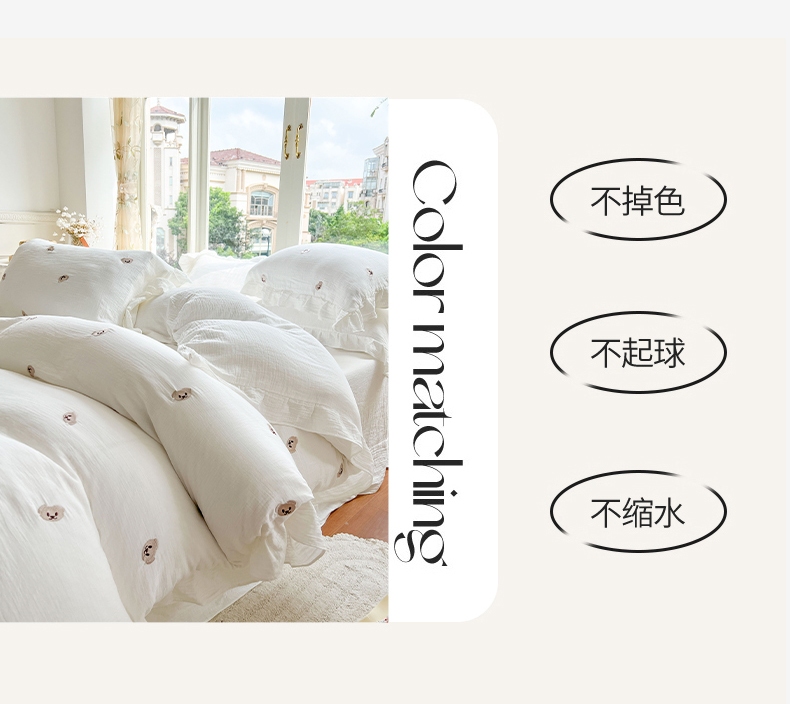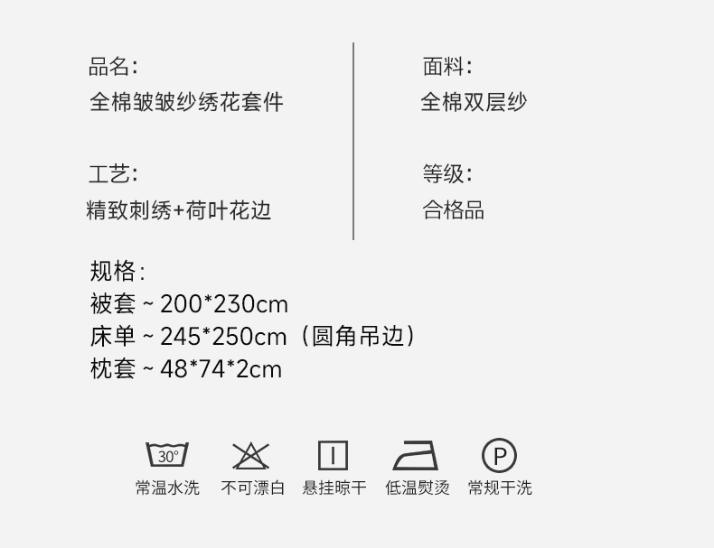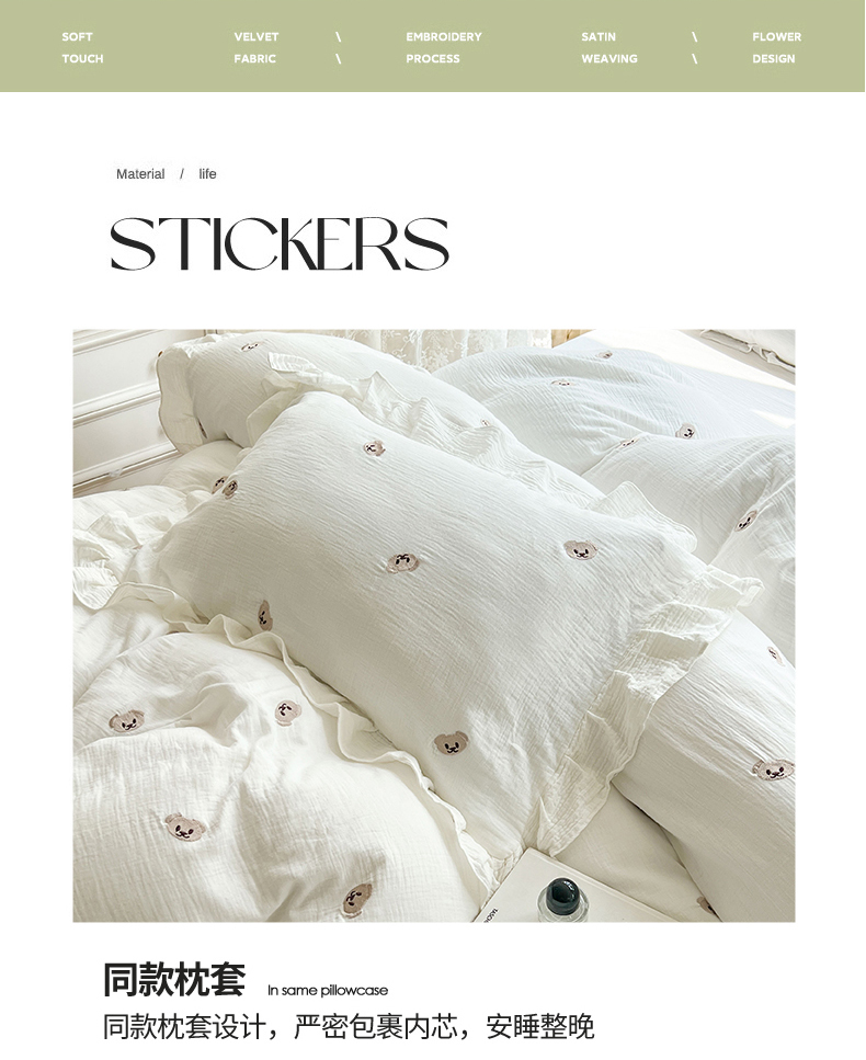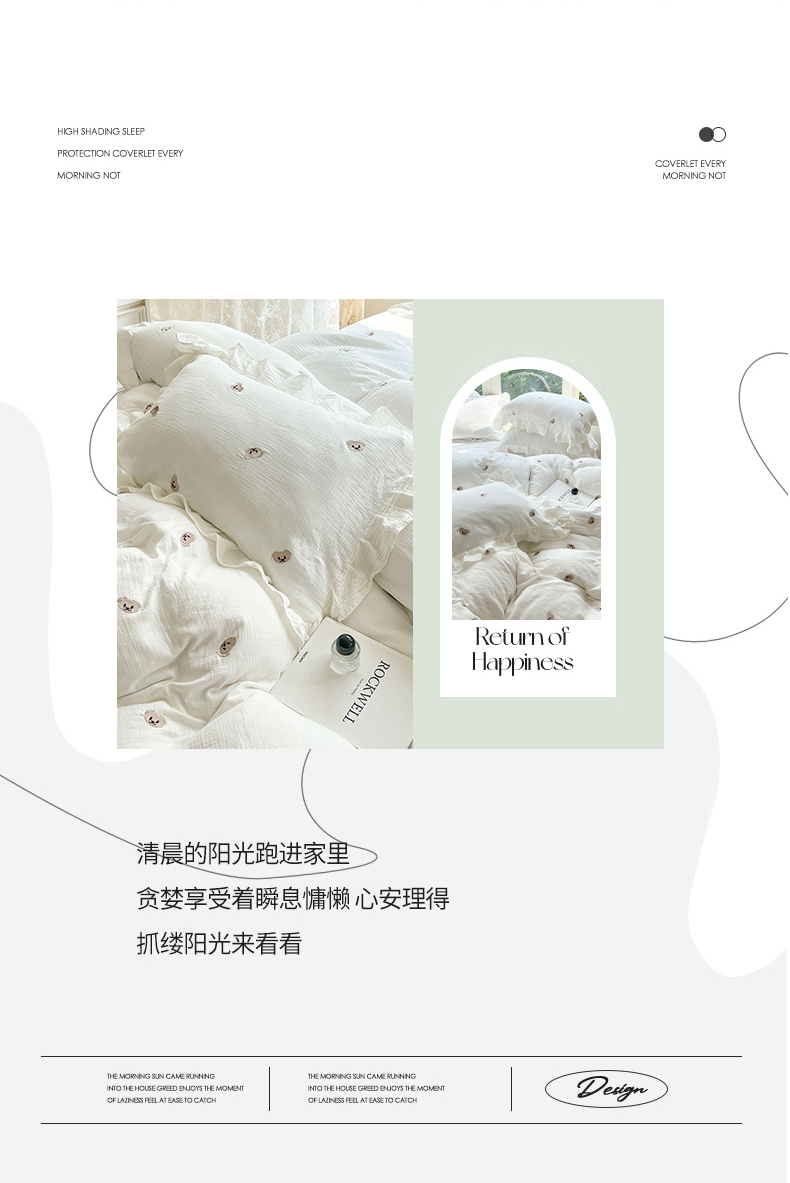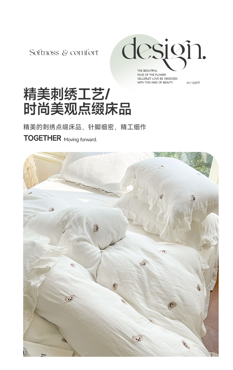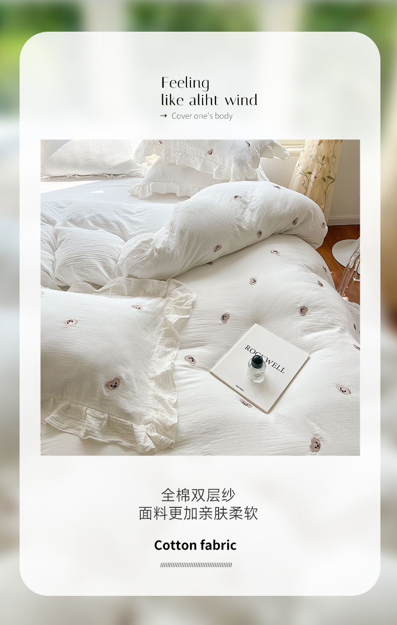 商品名称:木楌家居 2024秋冬全棉皱皱纱荷叶边刺绣工艺款四件套 米诺