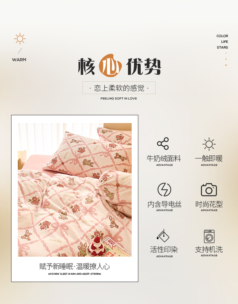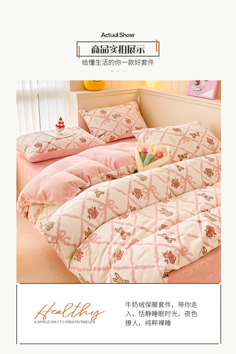 商品名称:桃子 2023新款ins小清新韩系卡通少女心奶油兔子加厚牛奶绒系列四件套-第一批 绒-菲丽