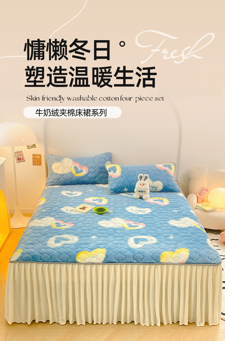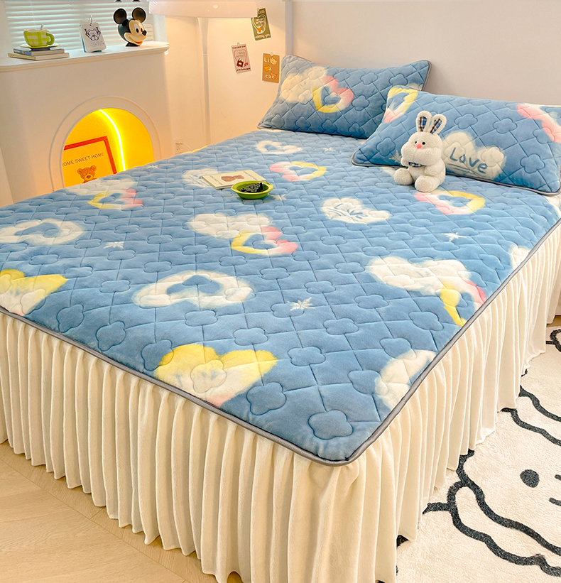 圣比熊 牛奶绒夹棉床裙床罩床单床盖床护垫套三件套 爱意浓浓