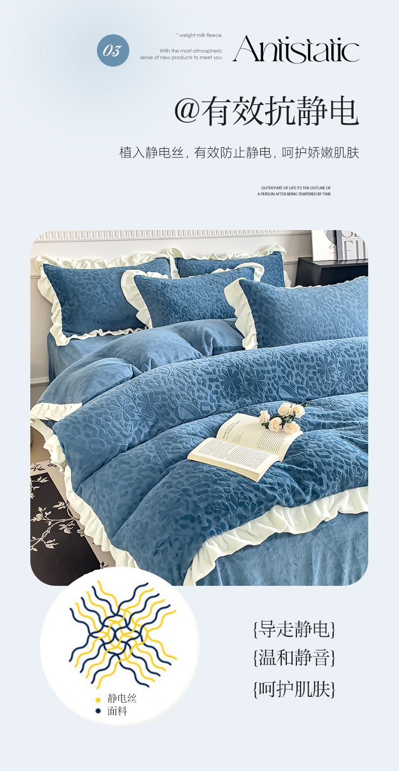 商品名称:铠畅家纺 2023新款花边雕花牛奶绒四件套-飘逸系列 飘逸-蓝
