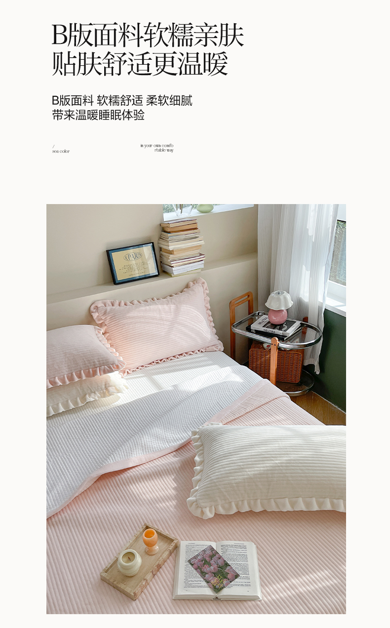 (总)笔墨家居 奶油系公主风撞色40支纯棉水洗棉四件套实拍,小苍兰,莫兰迪,青烟蓝,秋香桔,云朵白