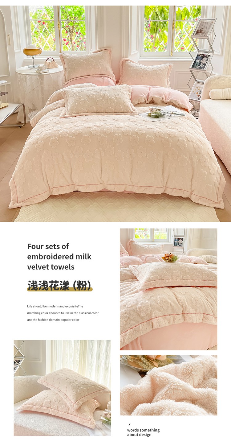 商品名称:呗旺鹿 2023新款高克重纯色剪花雕花压花提花牛奶绒四件套直播 浅浅花漾-粉