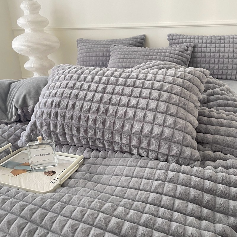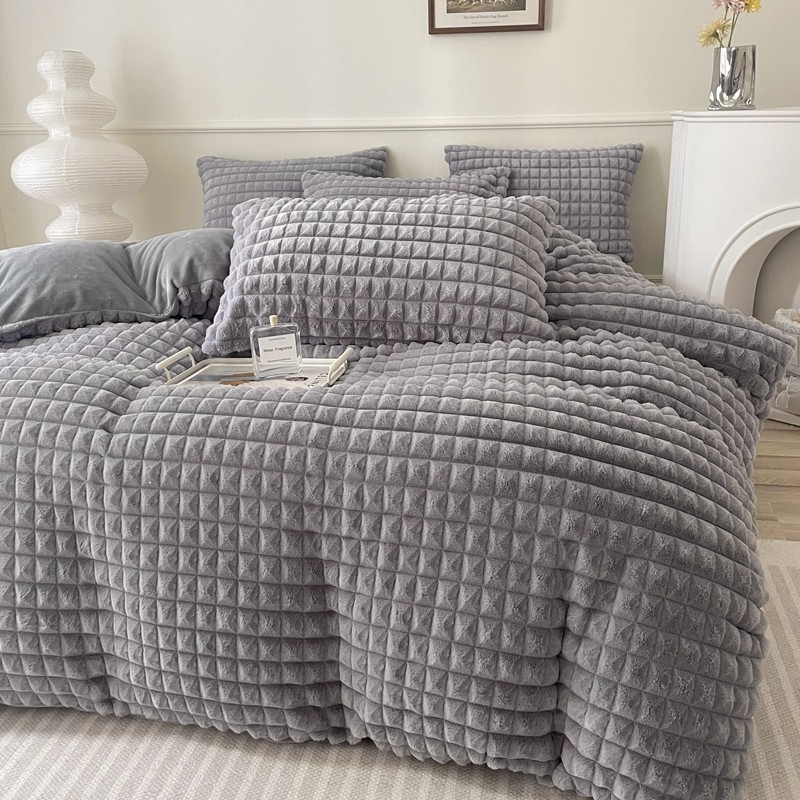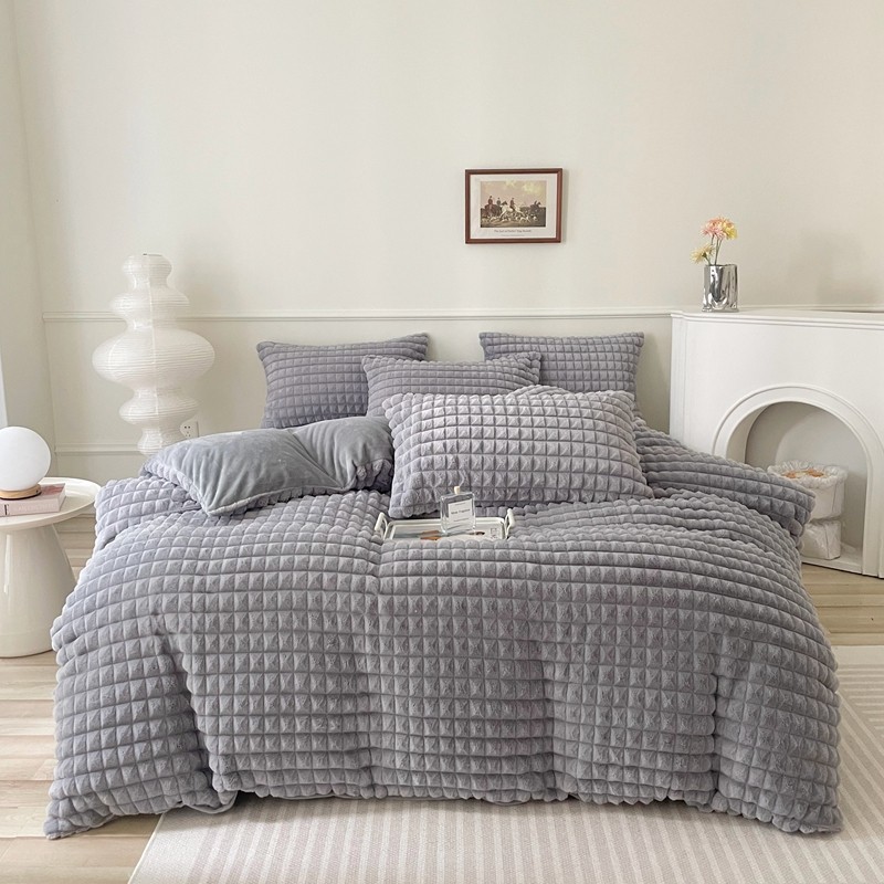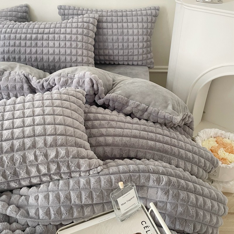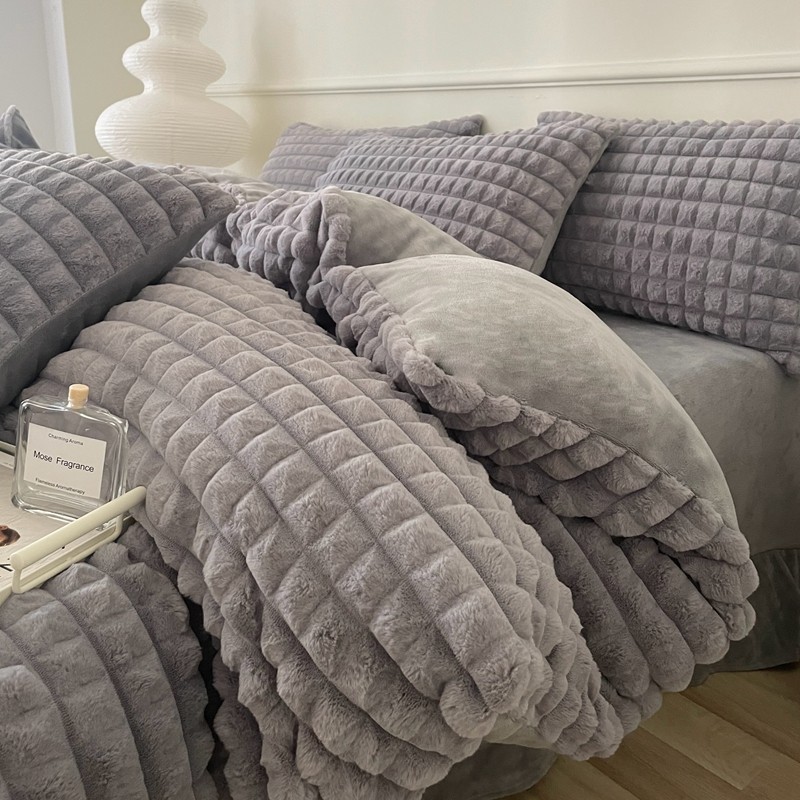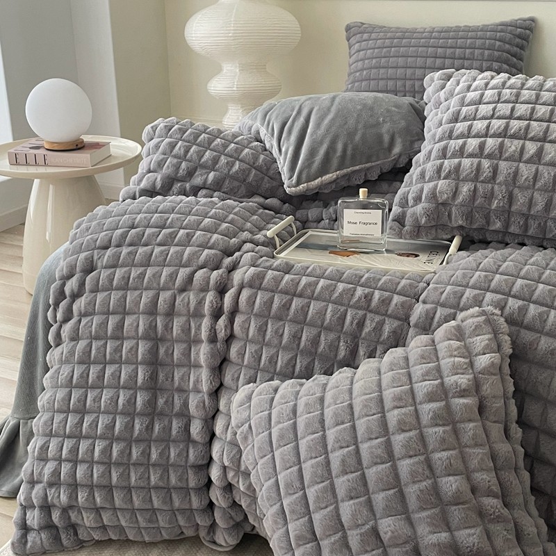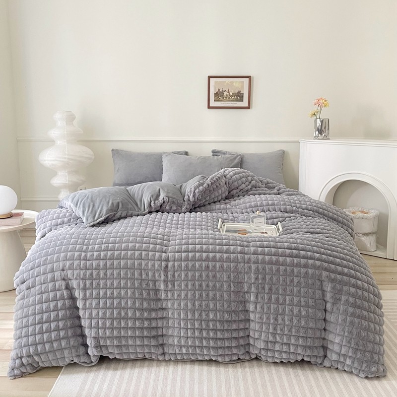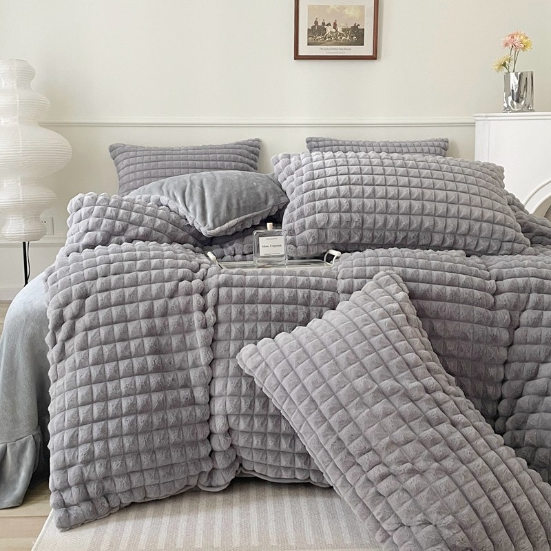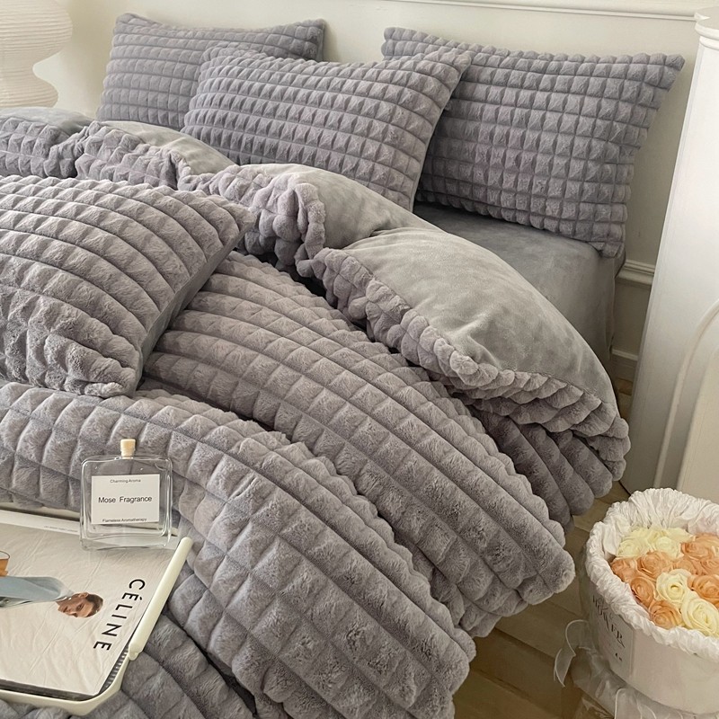 商品名称:畅畅家纺 2023新款兔毛绒兔兔绒懒兔绒立体剪花牛奶绒四件套 泡芙格-灰