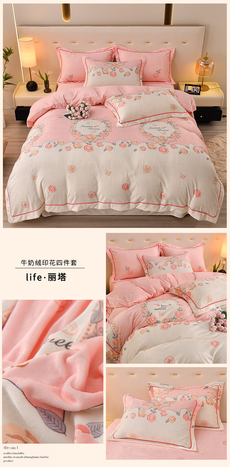 商品名称:同田家纺 2023新款加厚保暖牛奶绒印花四件套 丽塔