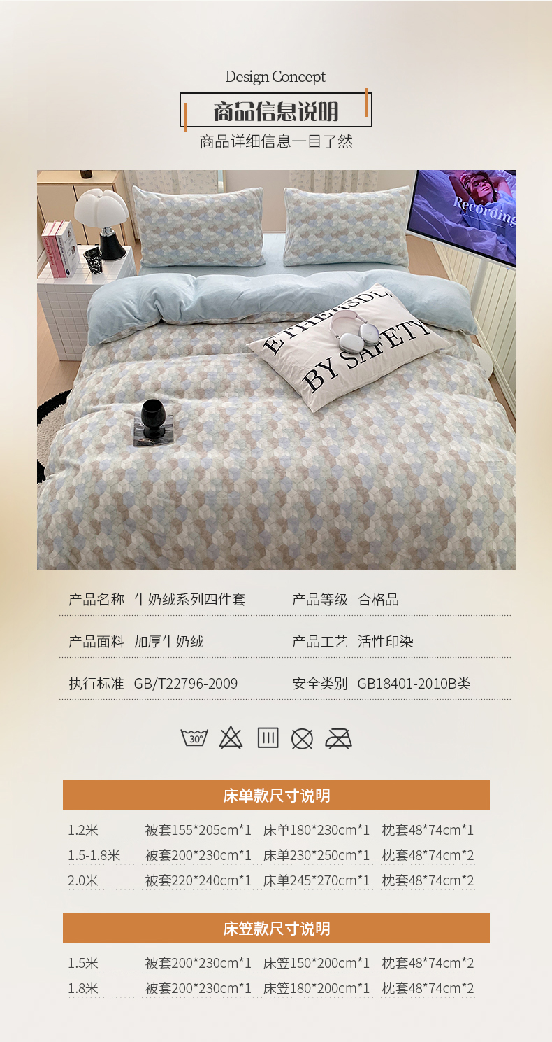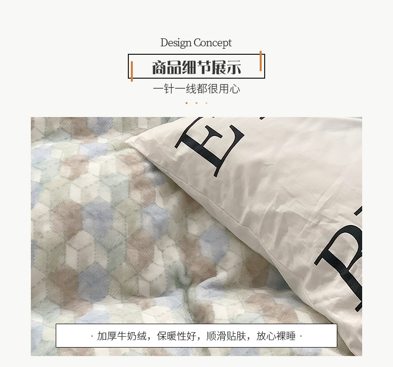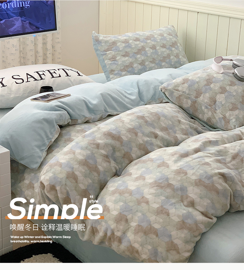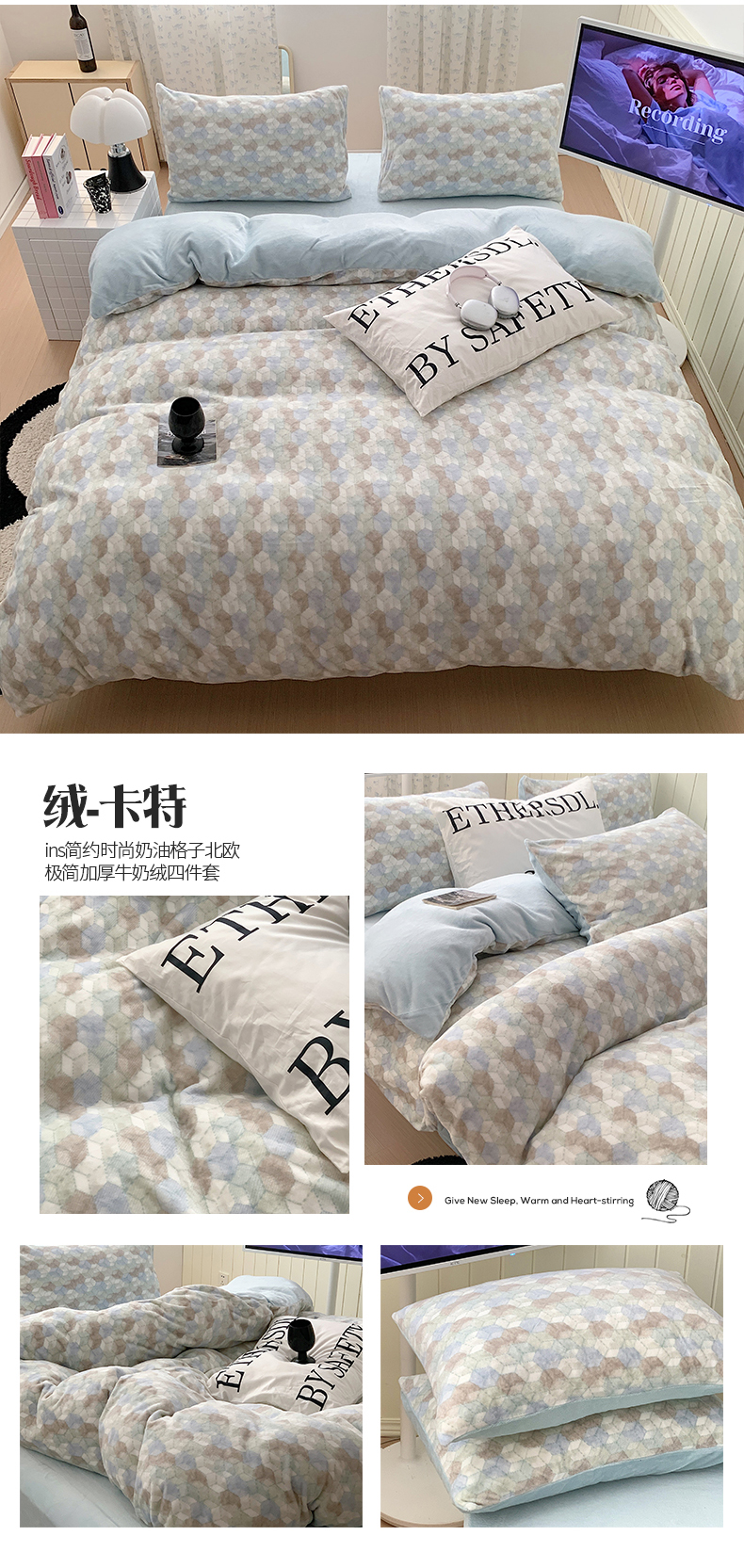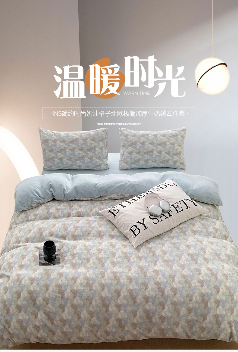 商品名称:桃子家居 2023新款ins简约时尚奶油格子北欧极简加厚牛奶绒四件套 卡特