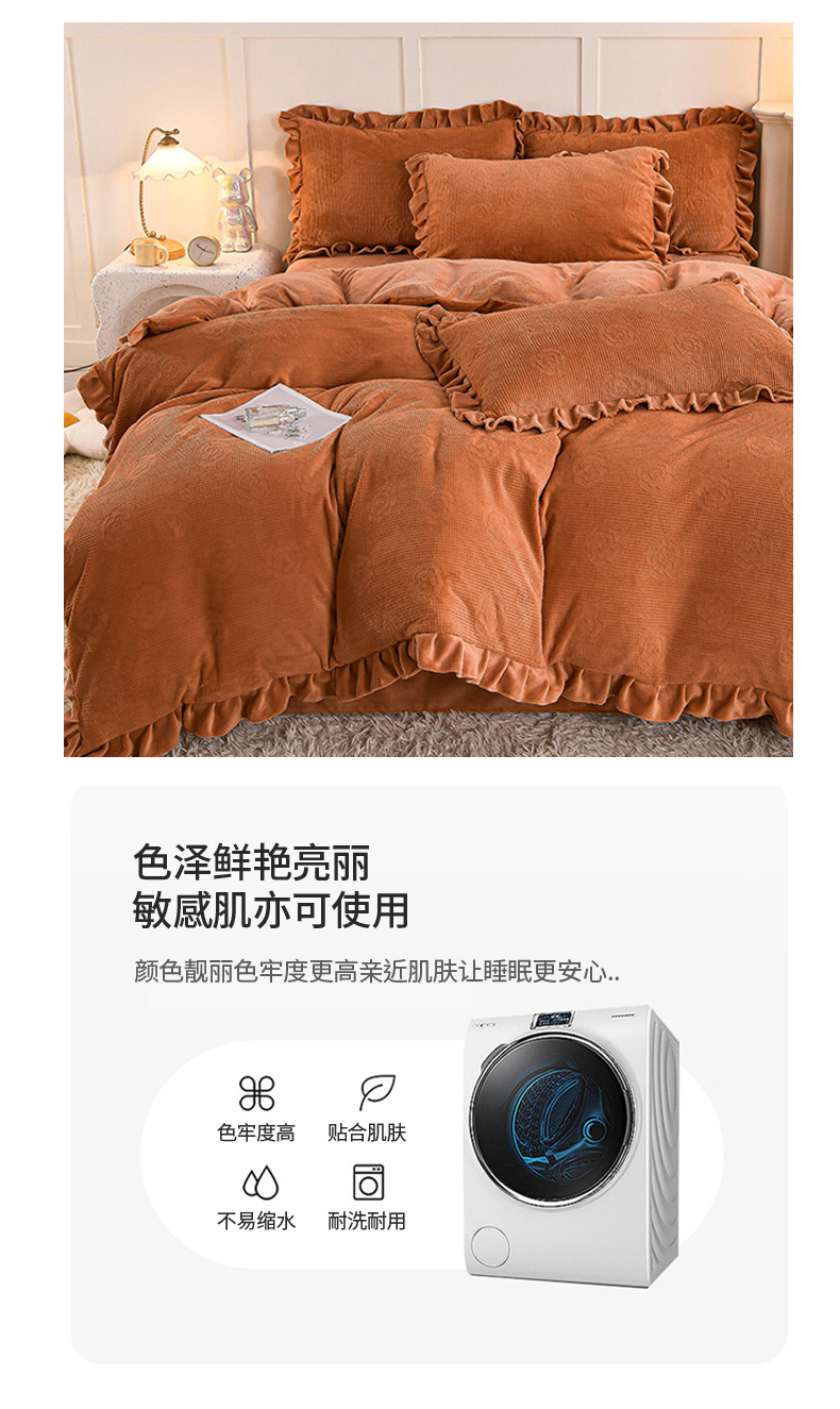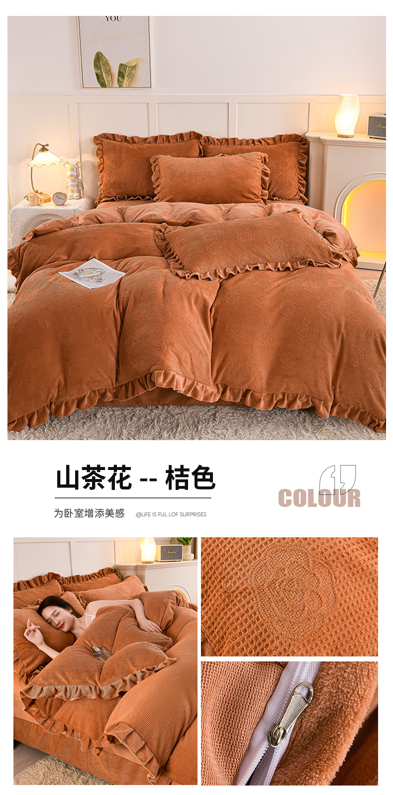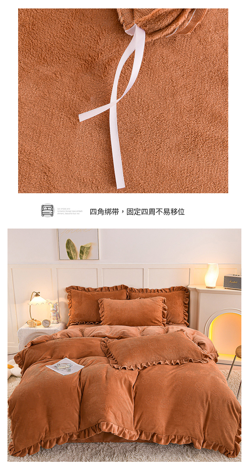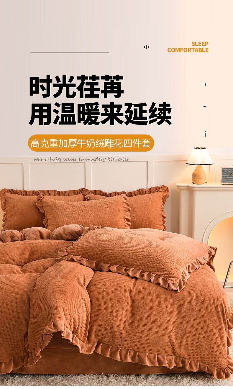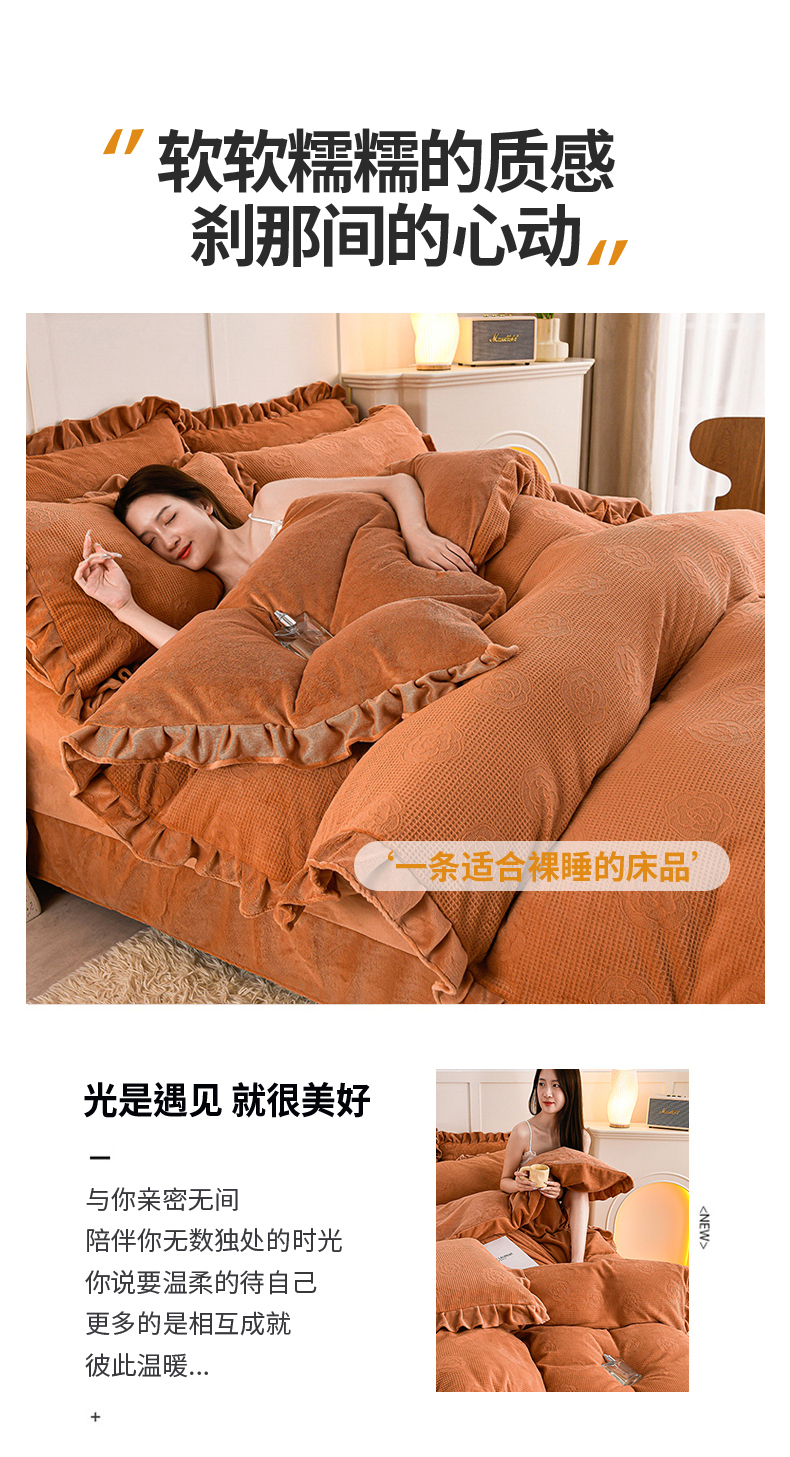 商品名称:苏迪 2025新款牛奶绒四件套-山茶花 山茶花--桔色