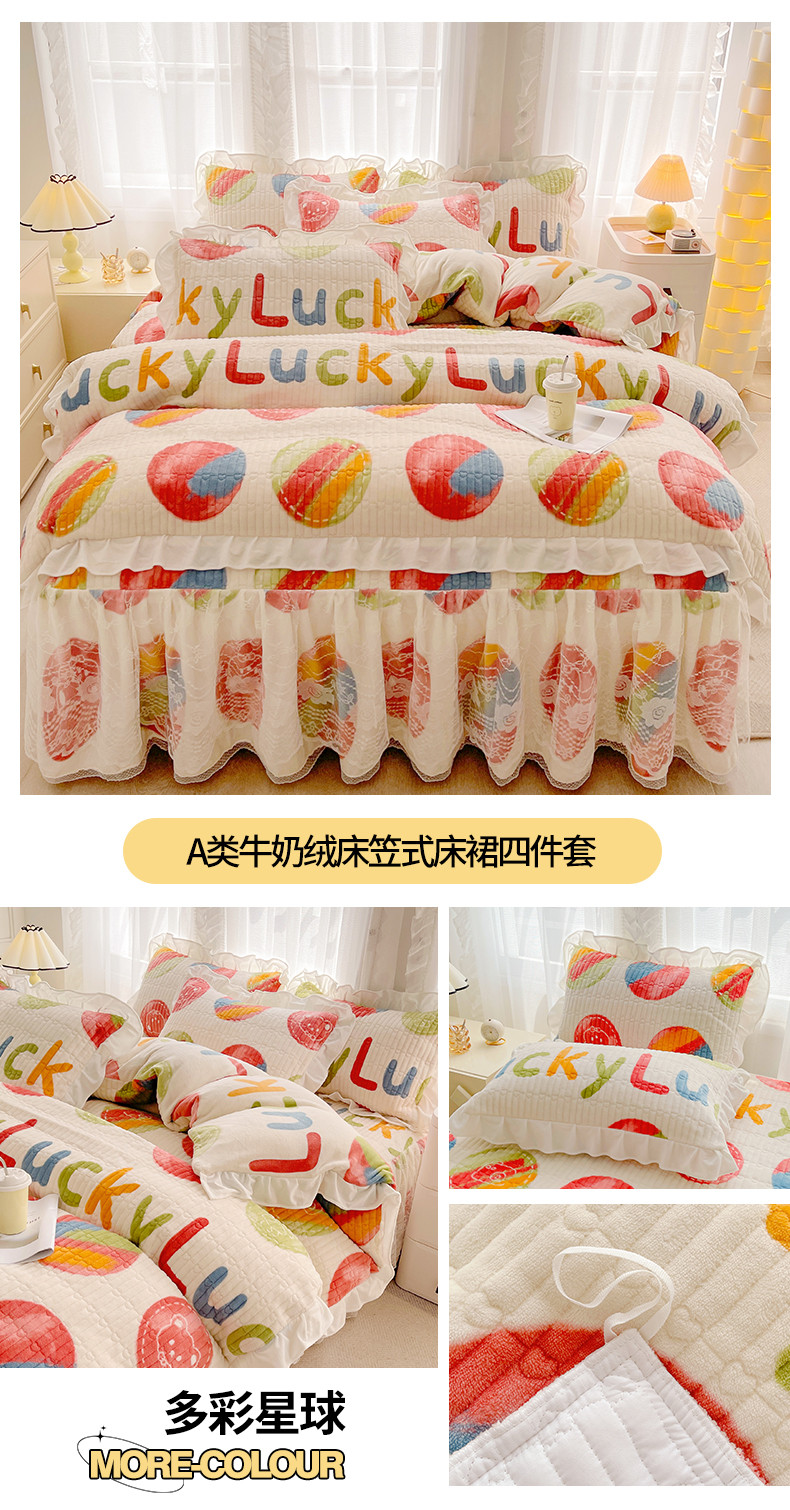 当前位置: 91家纺网 > 商品网购 > 床品套件 > 四件套 > 牛奶绒四件套 > 宜凡家纺 2023新款牛奶绒印花夹棉被套床笠式床裙四件套 多彩星球