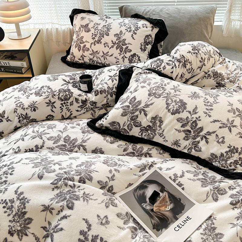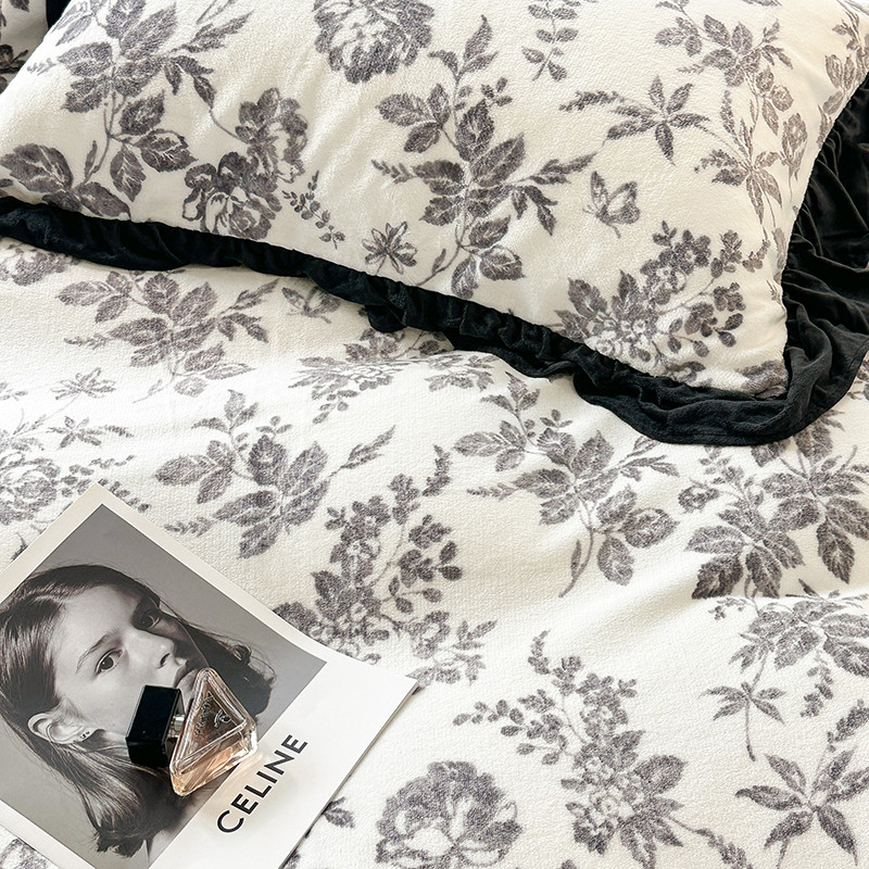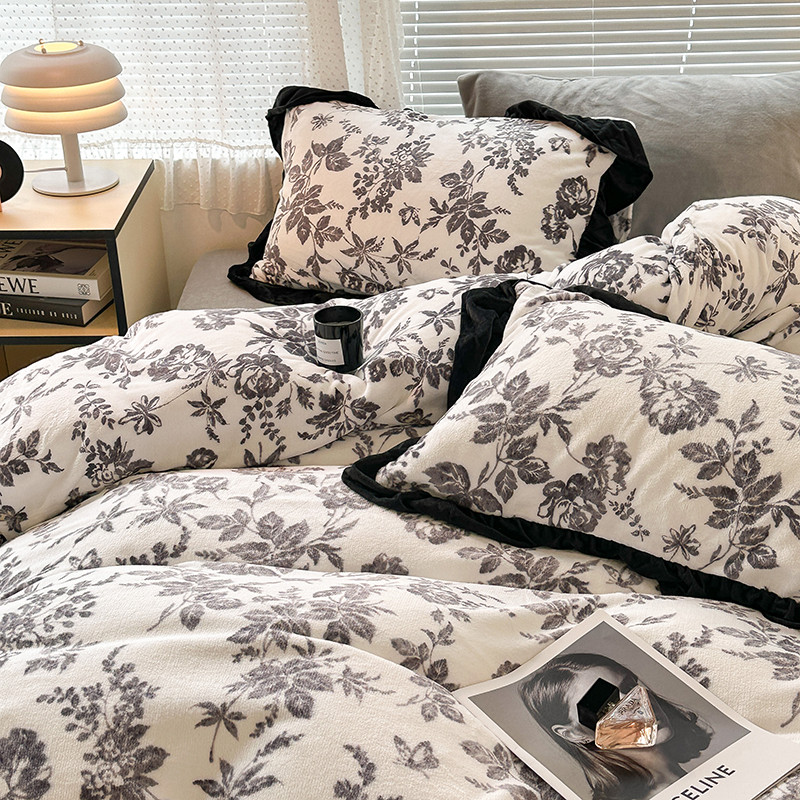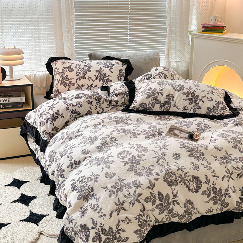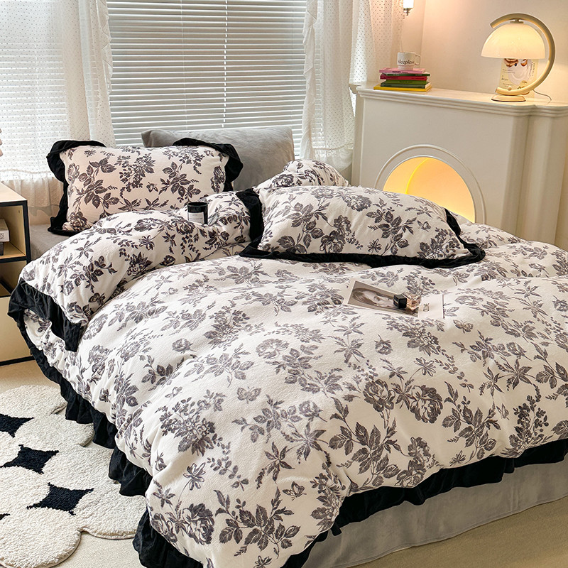 昔可 2023新款韩系ins花边款牛奶绒四件套 法式茶歇黑