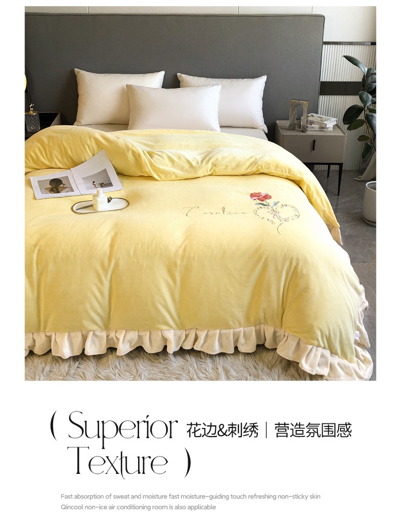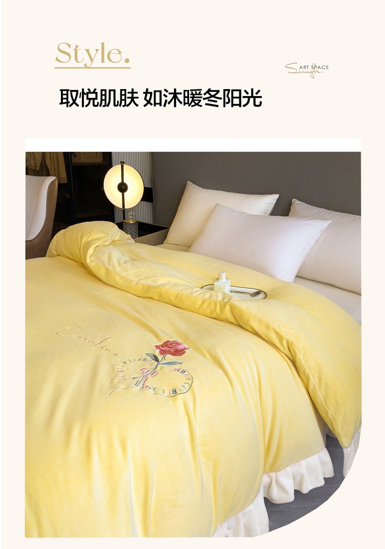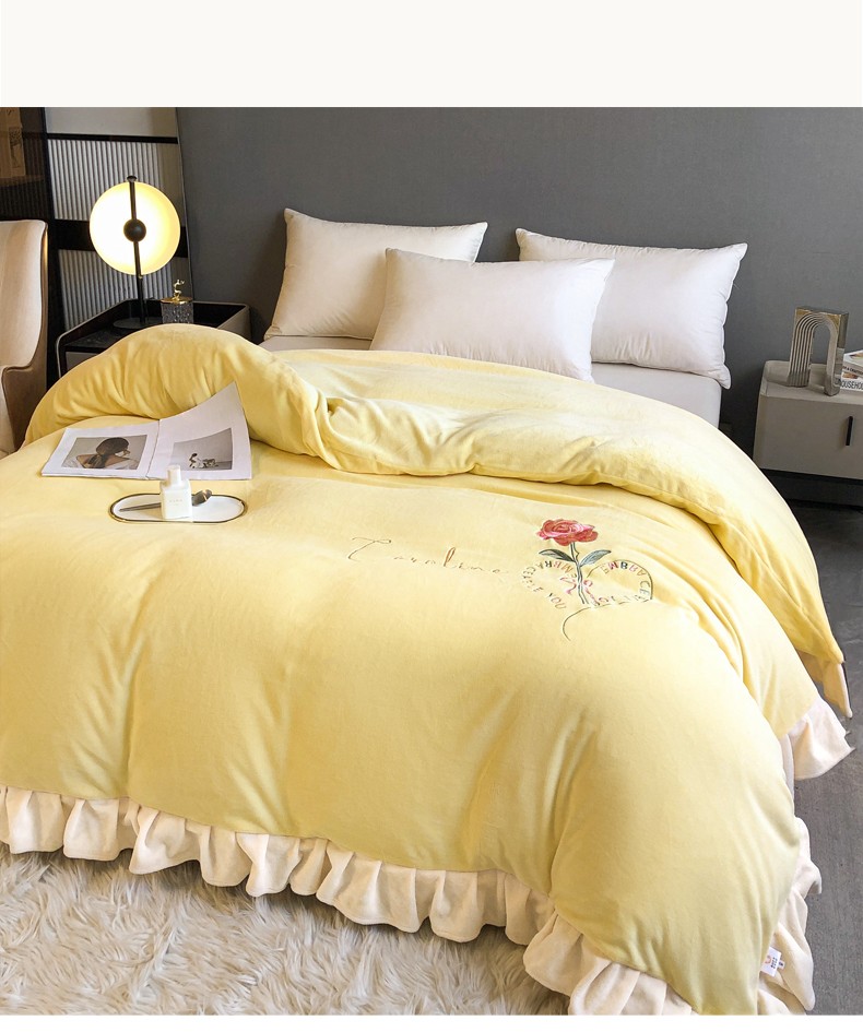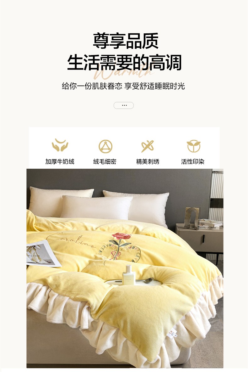 商品名称:7v 2023新款牛奶绒韩版花边刺绣被套法兰绒宝宝绒兔绒单被套 偏爱-嫩黄