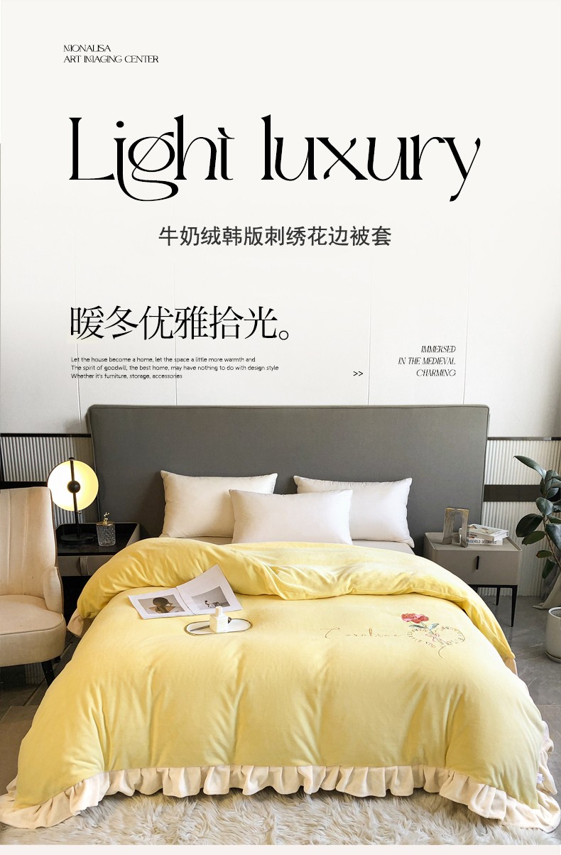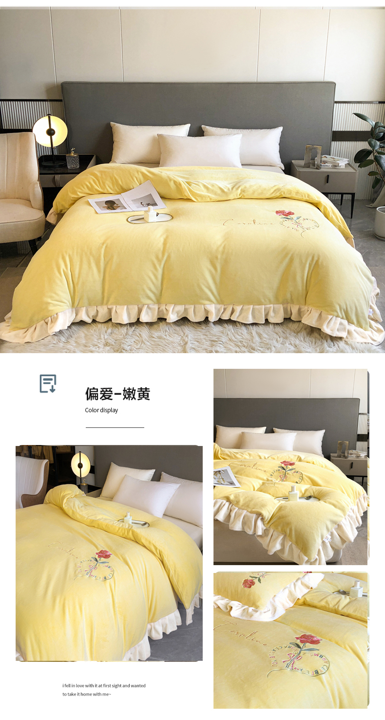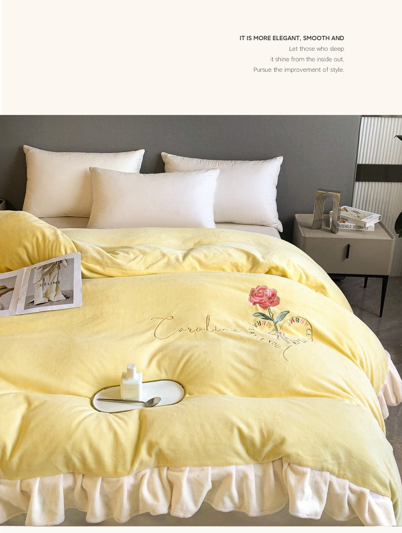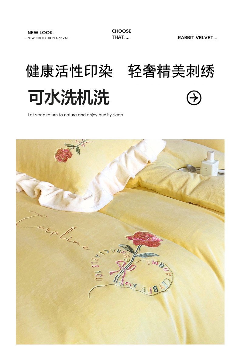 商品名称:7v 2023新款牛奶绒韩版花边刺绣被套法兰绒宝宝绒兔绒单被套 偏爱-嫩黄