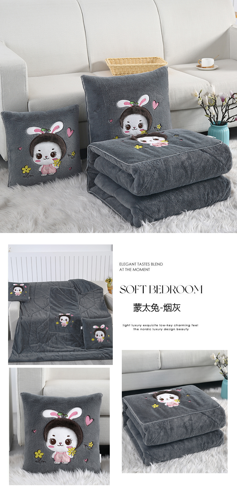 商品名称:伊可爱抱枕被 2023新款兔毛绒贴布绣抱枕被-蒙太兔 蒙太兔-烟灰