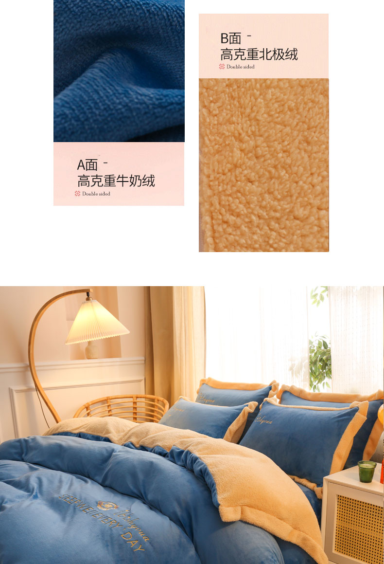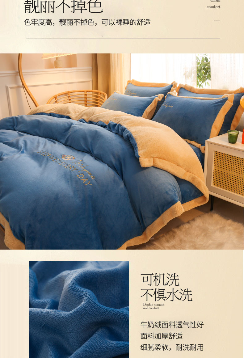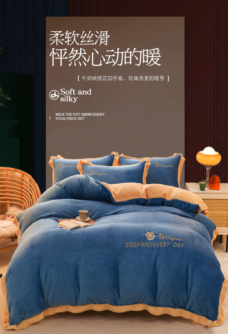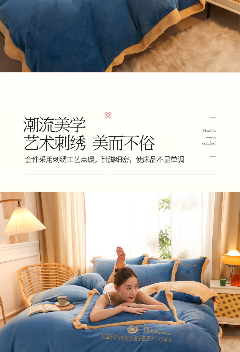 当前位置: 91家纺网 > 商品网购 > 床品套件 > 四件套 > 牛奶绒四件套 > 啊雅家居 2026新款绣花牛奶绒加羊羔绒四件套 克莱因蓝魔加米黄