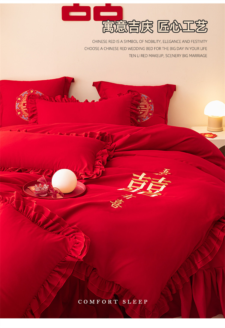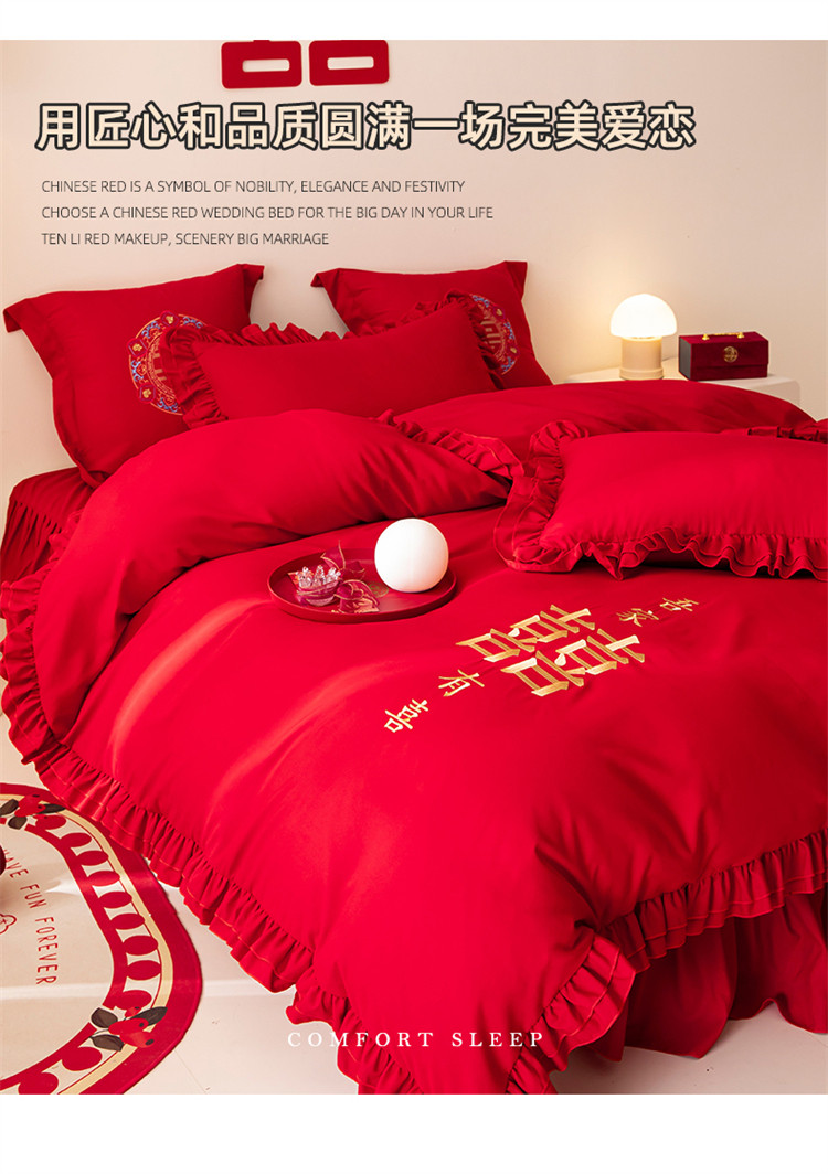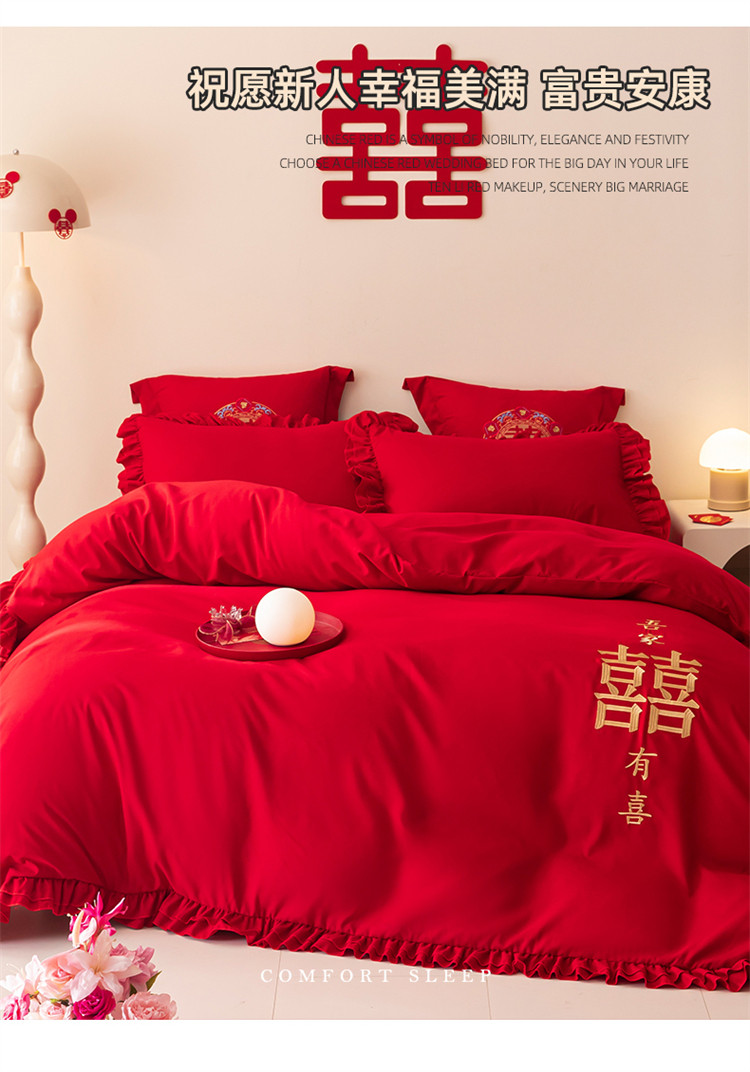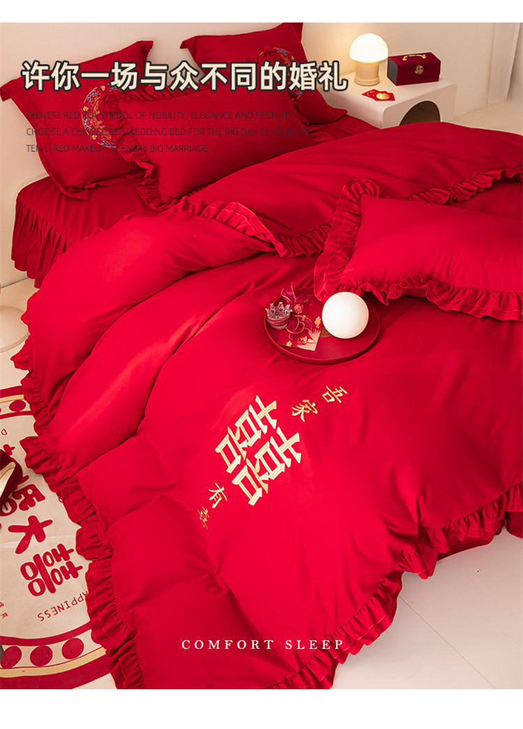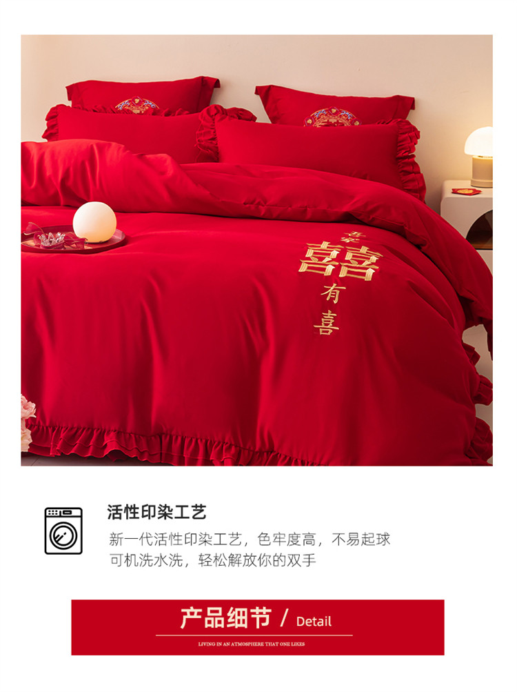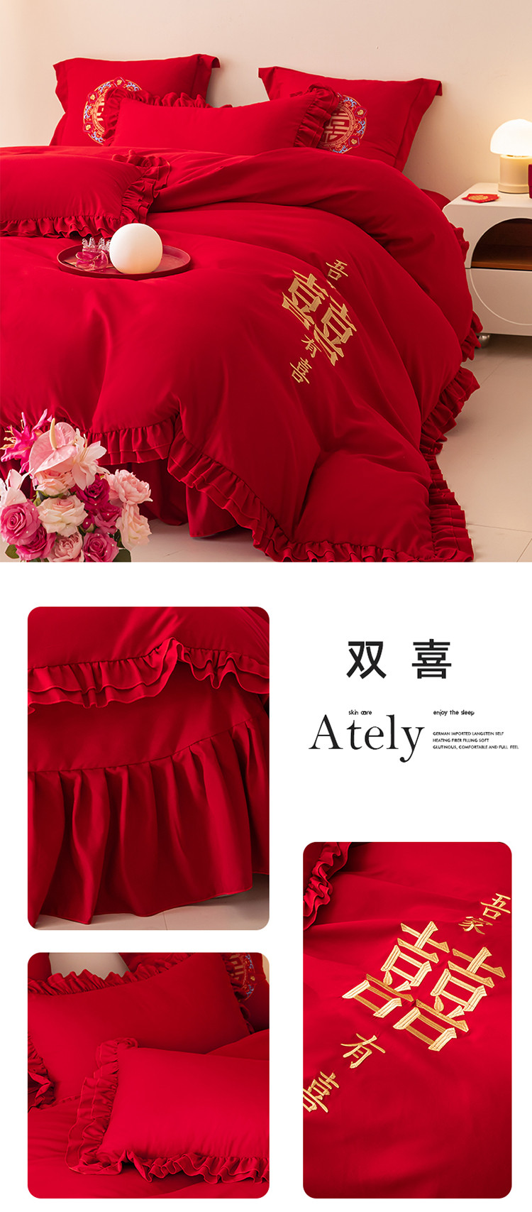当前位置: 91家纺网 > 商品网购 > 床品套件 > 四件套 > 普通磨毛四件套 > 2025新款磨毛时尚花边款床裙婚庆四件套 花边款-双喜