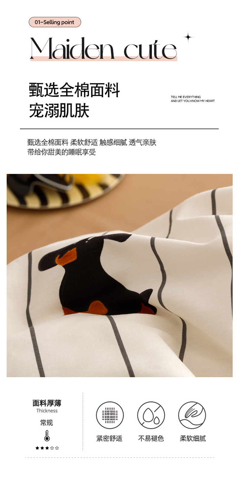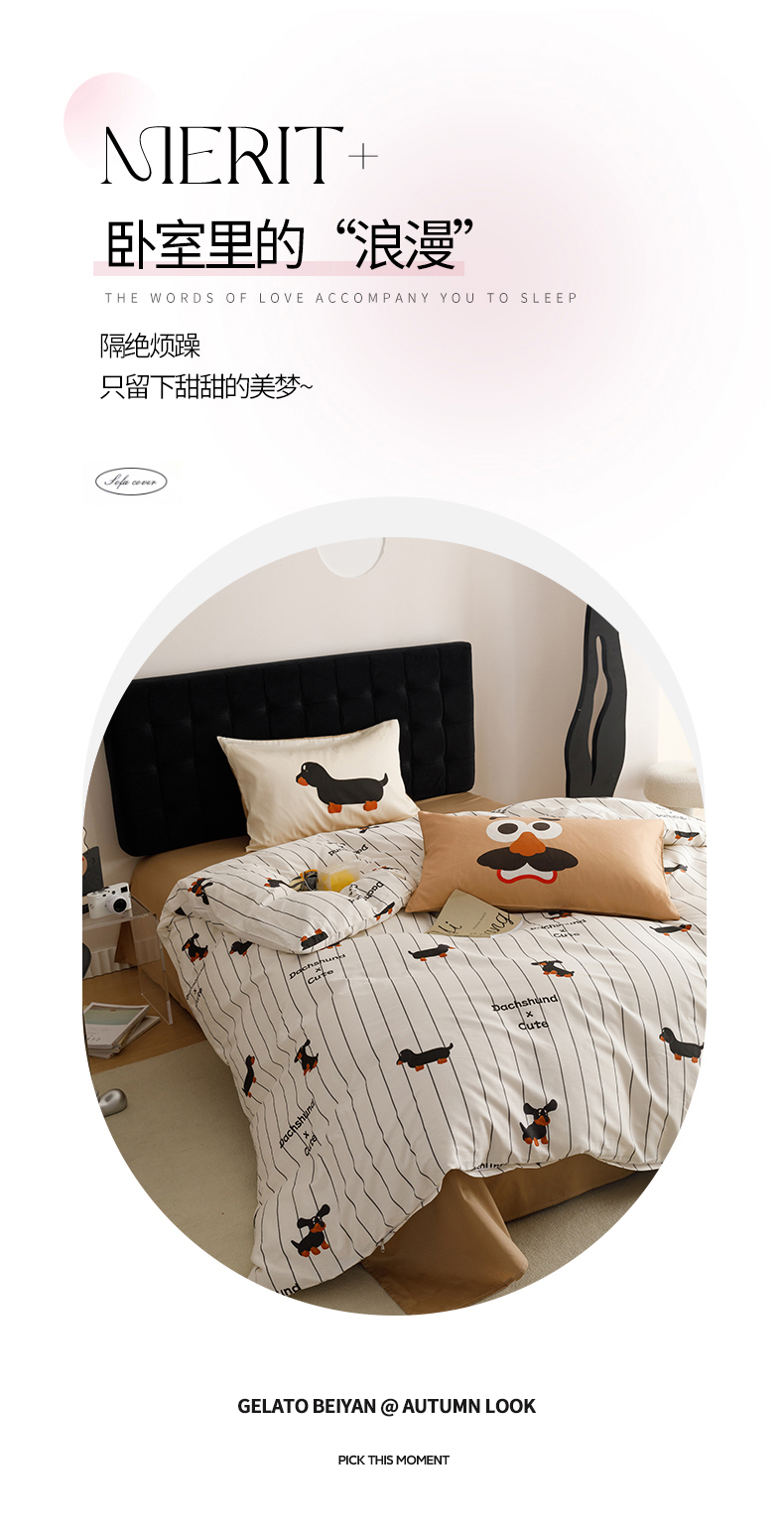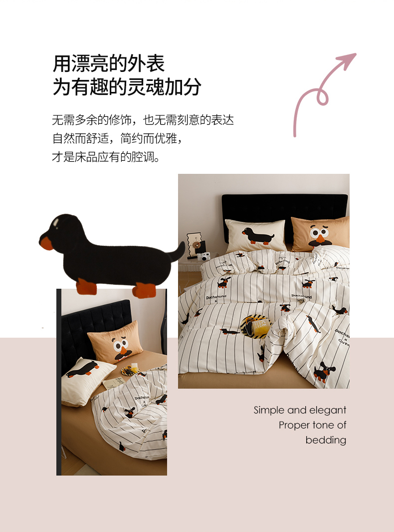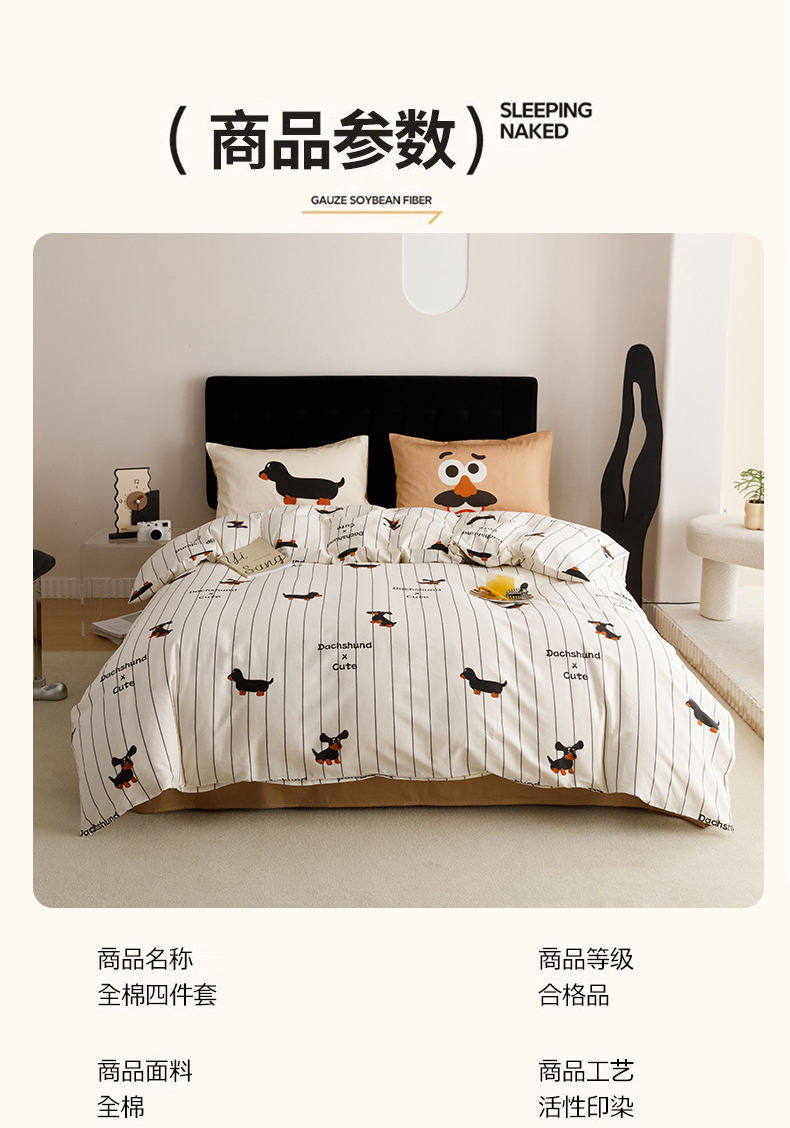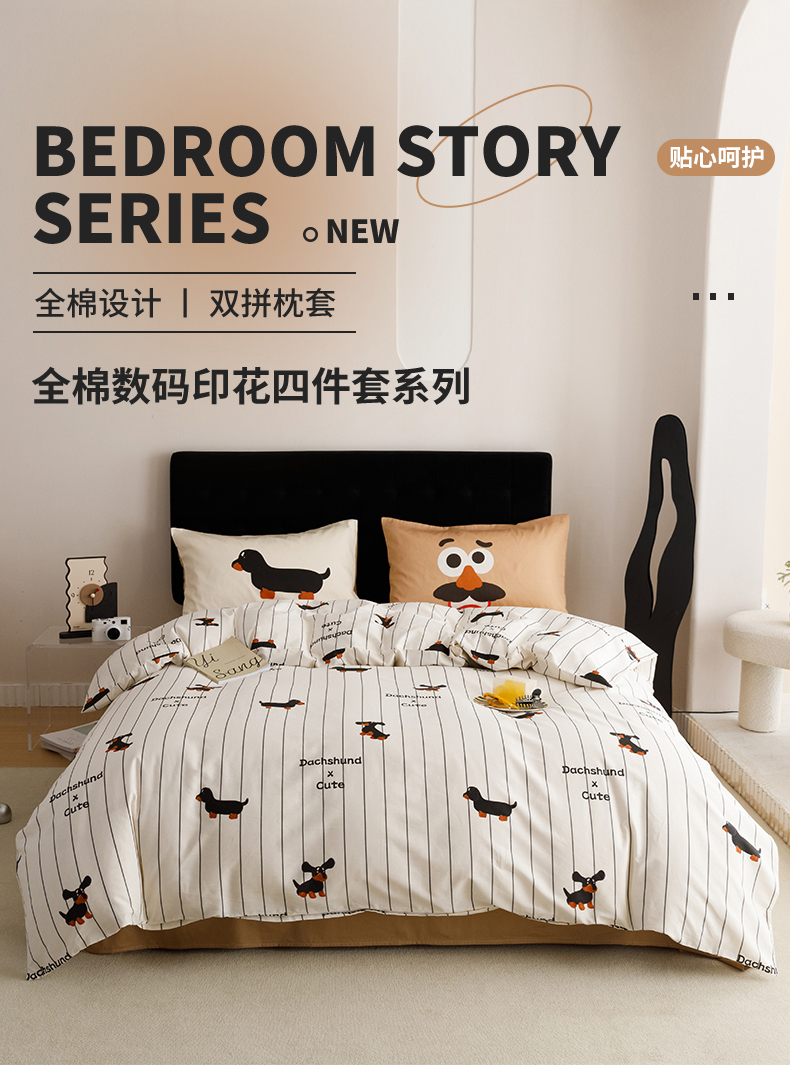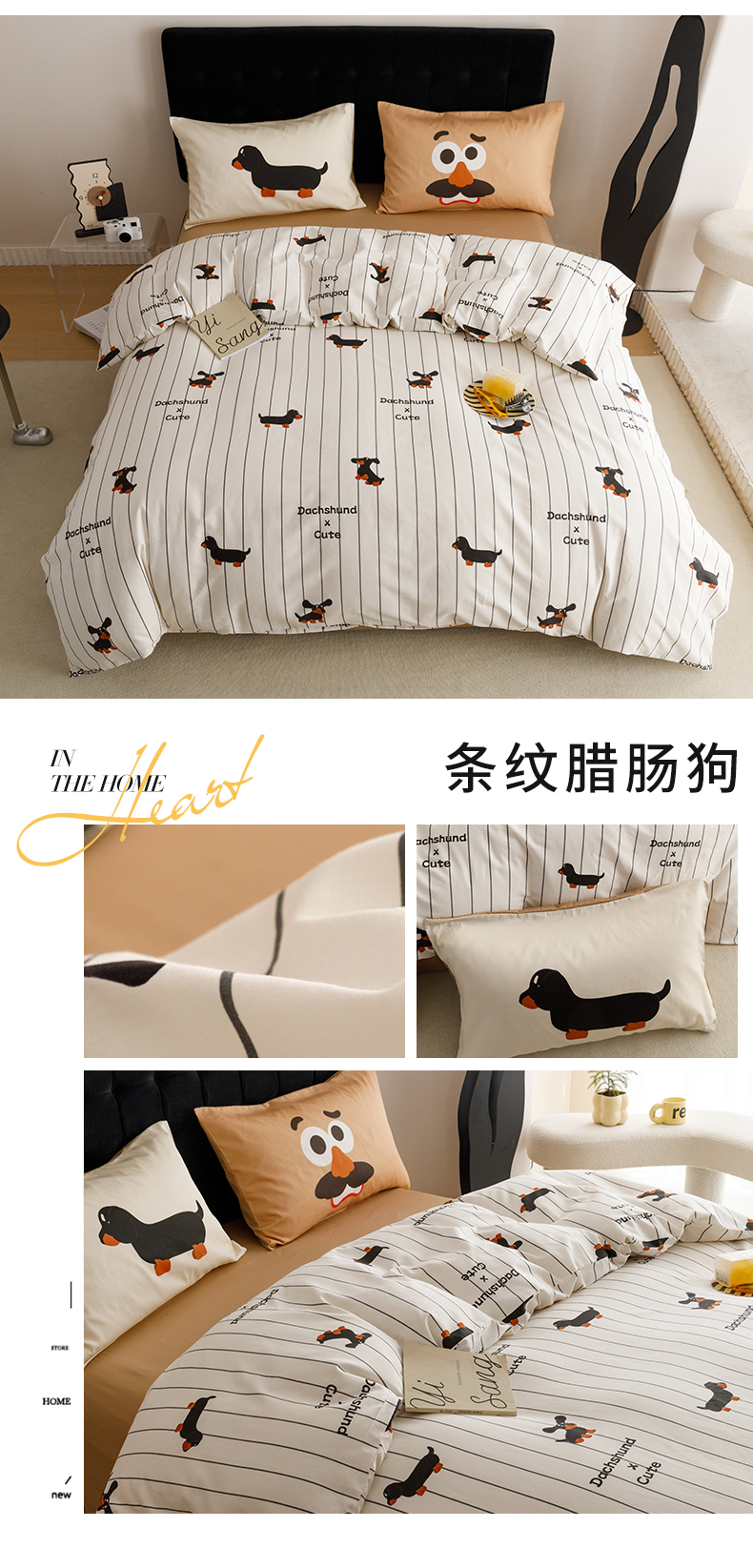 珺柔家纺 2024年款13070全棉数码印花四件套 条纹腊肠狗