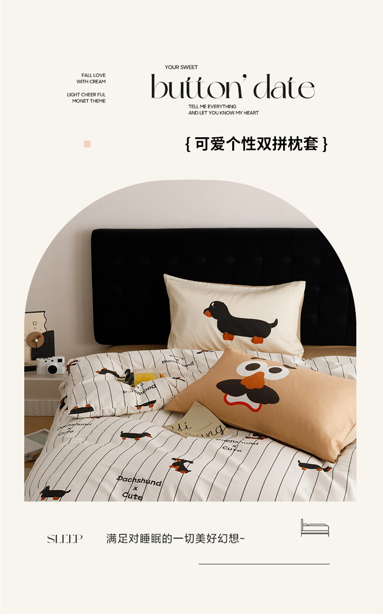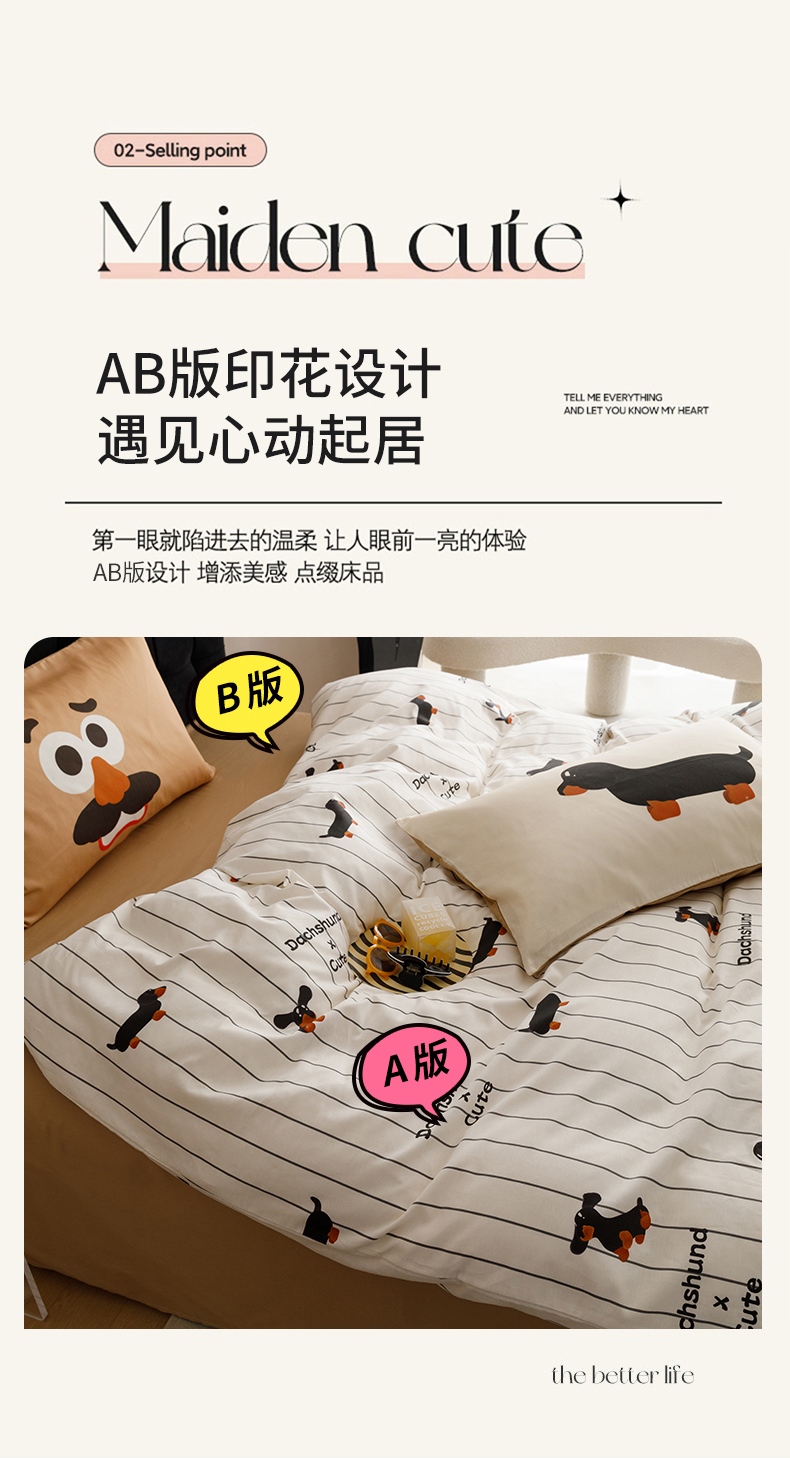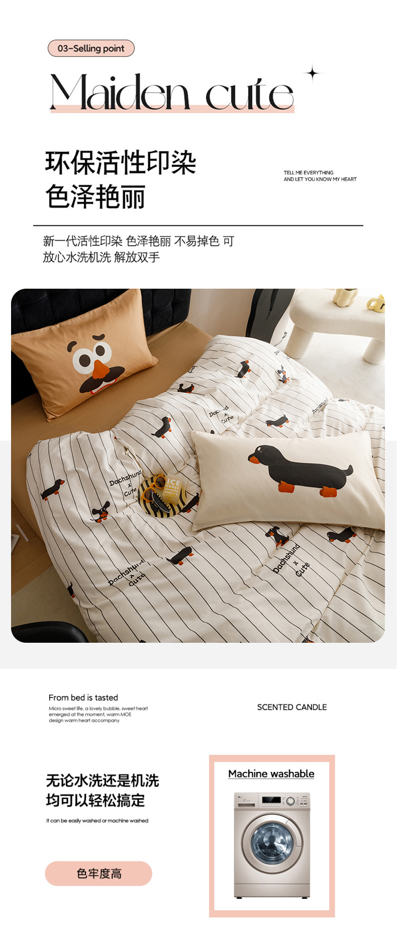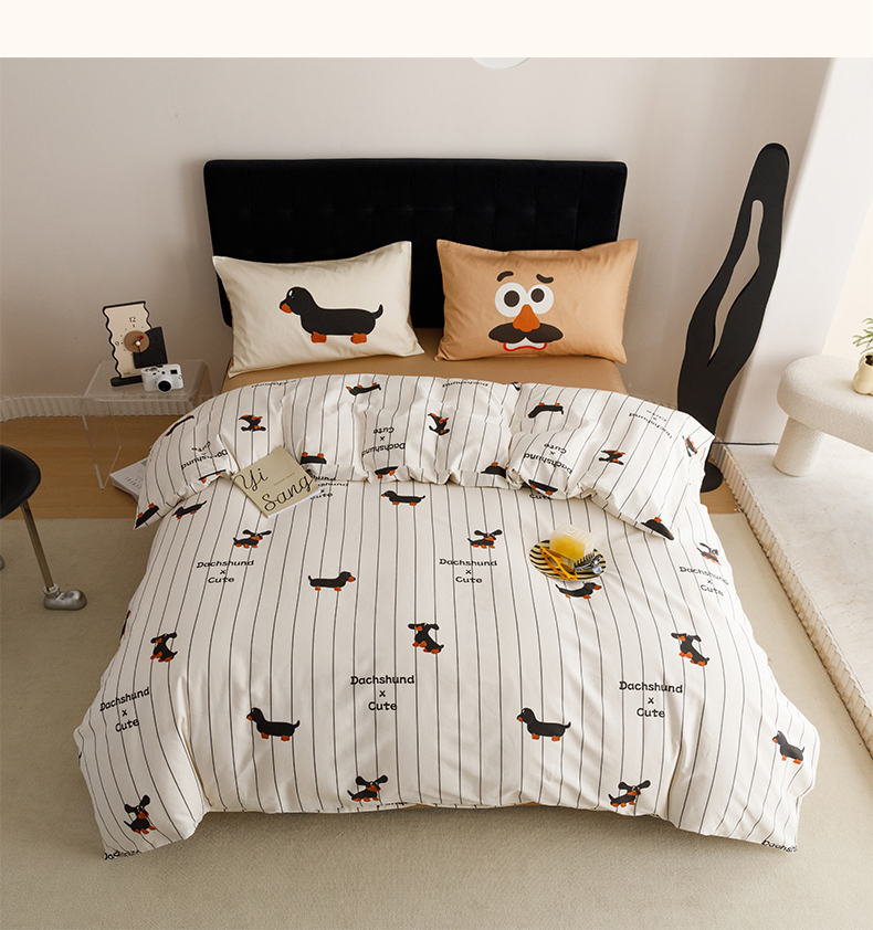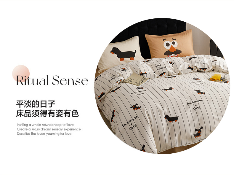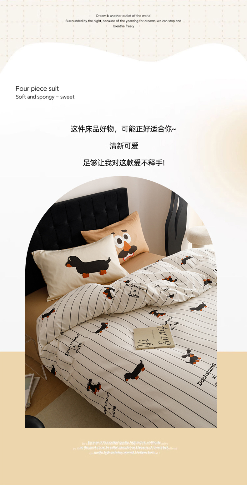珺柔家纺 2024年款13070全棉数码印花四件套 条纹腊肠狗