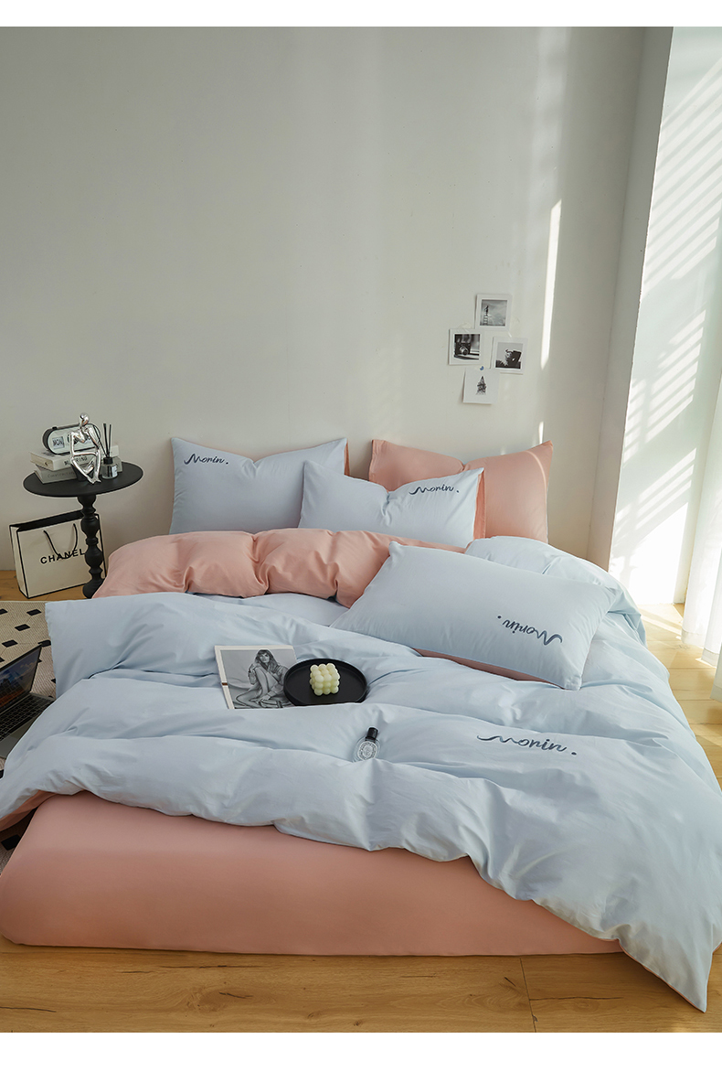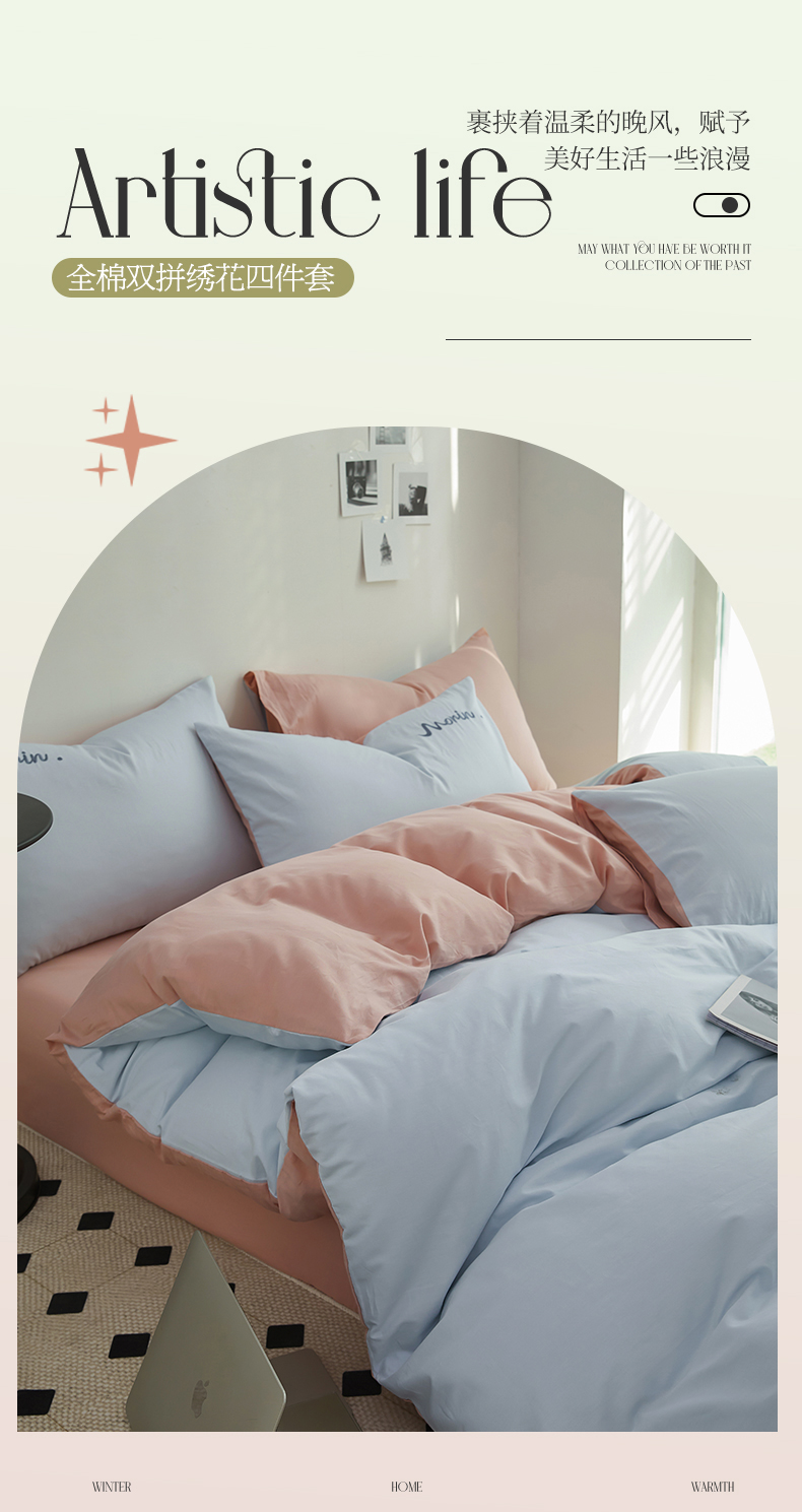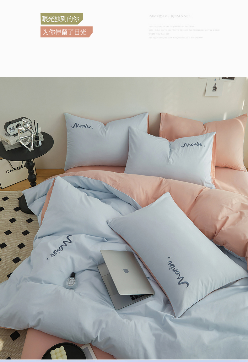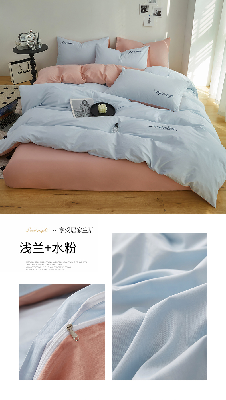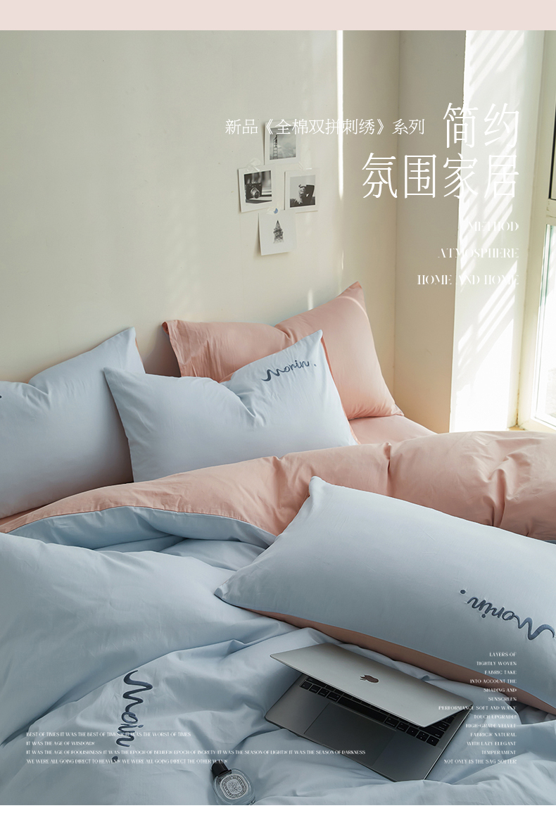商品名称:多品家纺 2024新款全棉纯色绣花四件套 浅兰+水粉