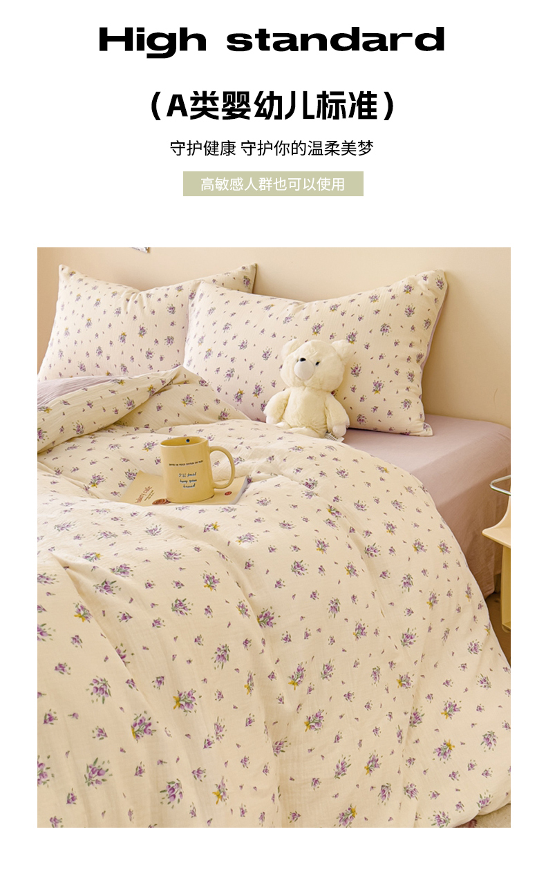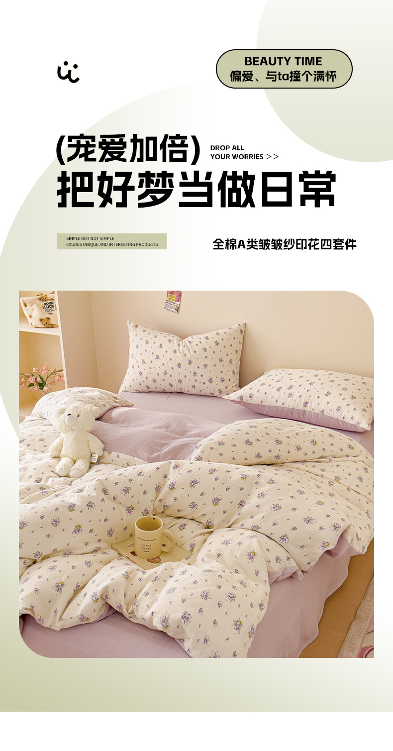 商品名称:木楌 2025新款全棉A类皱皱纱印花四件套 紫萱