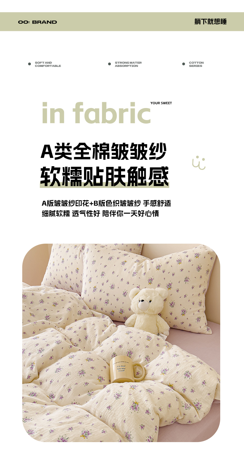 (总)木楌家居 2025新款A类全棉皱皱纱印花四件套,甜心宝贝,薄雾玫瑰,枫林 咖,枫林 绿,可颂,兰亭序,梦蝶,觅森,墨韵,晚棠,小确幸,伊洛娜,云梦泽,半夏 粉,草莓啵啵,初微,可心 兰,可心咖,哈尼,兰菲,黎夏 粉,黎夏 兰,木兰,奶油爱心,宁静,清颜,芮汐,时序 黄,时序 桔蓝,苏潼,西棠,潇湘,星月,悠然,月瑶