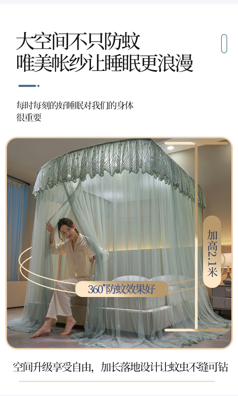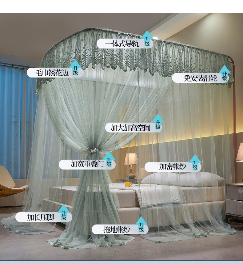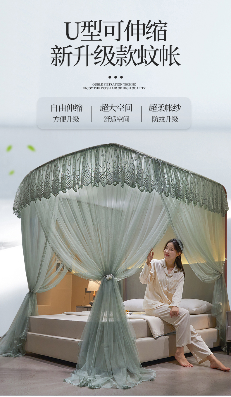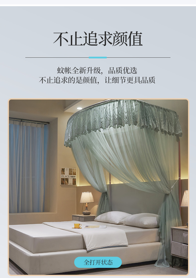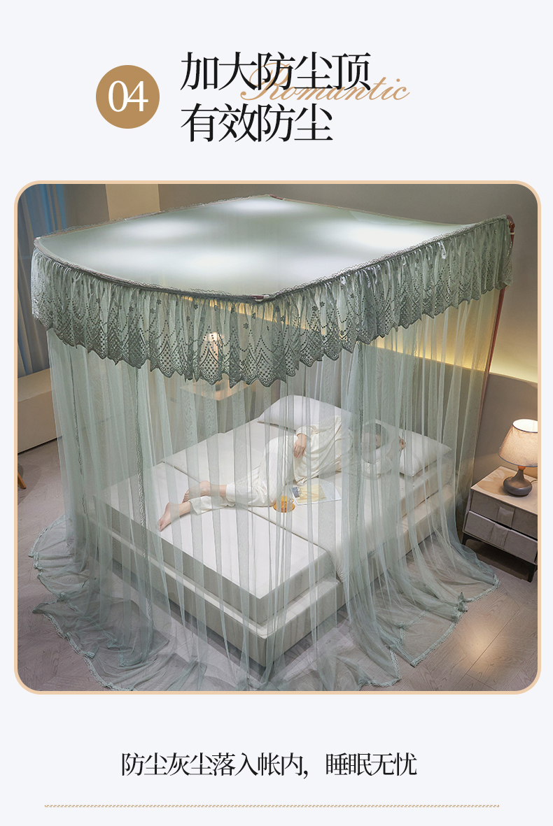 (总)夏彩 2025新款蕾丝U型防摔坐床蚊帐-88630,绿雅灰,藕玉色,香槟色