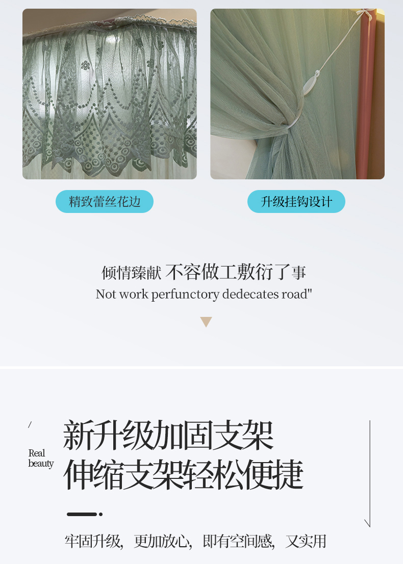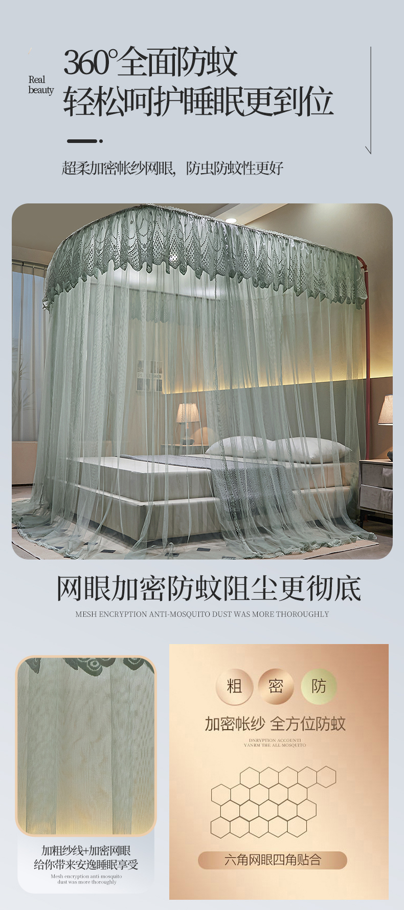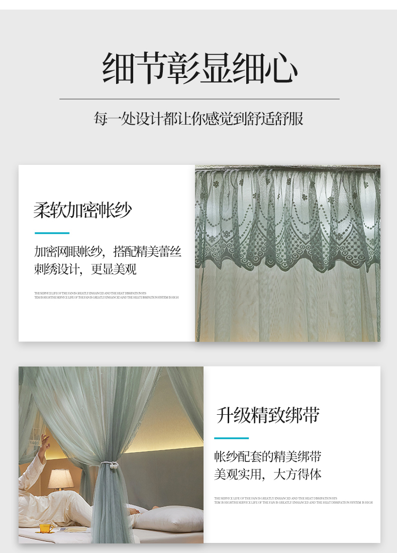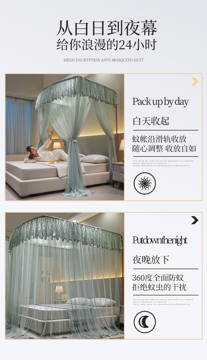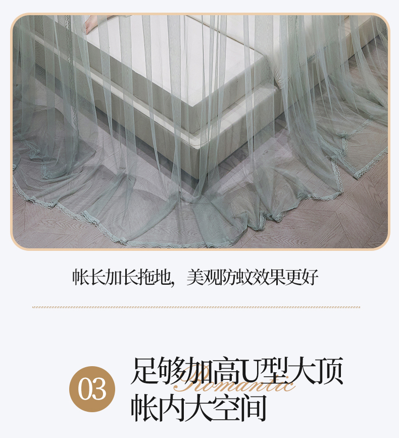 (总)夏彩 2025新款蕾丝U型防摔坐床蚊帐-88630,绿雅灰,藕玉色,香槟色