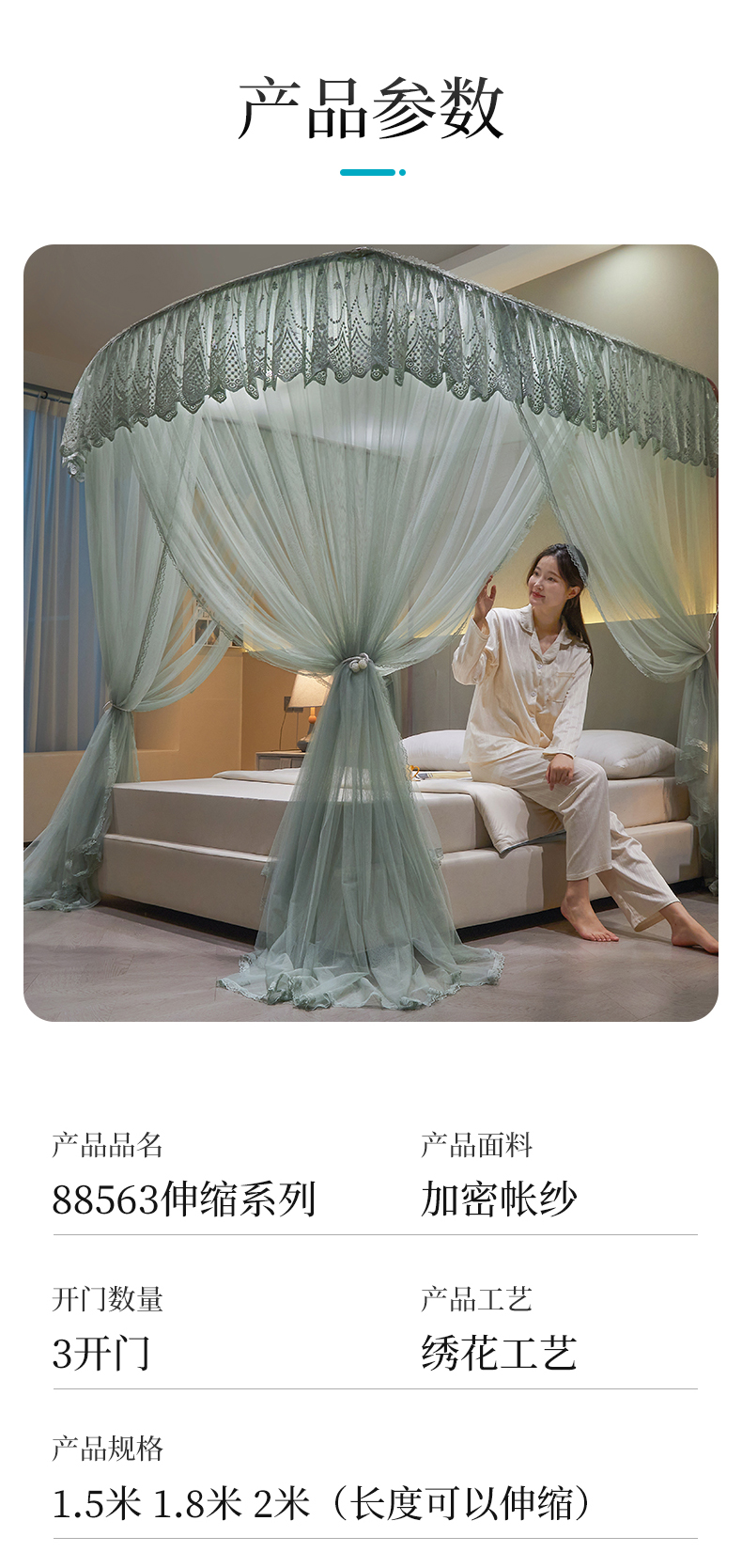 商品名称:夏彩 2024新款加柔加密长度可伸缩蚊帐-88563 88563-抹茶绿