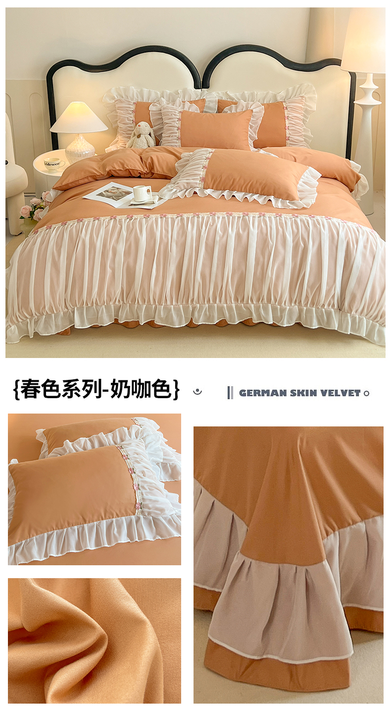 (总)芭比蔓 2024新款直播供货韩版花边款牛奶绒四件套,爱玛橙,宝石红,湖蓝,倾国粉,秋月黄,深灰,珍珠白,竹青绿