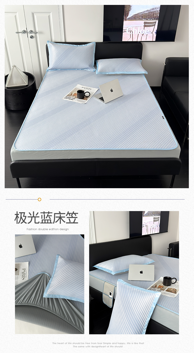 商品名称:三味舒屋 2025新款抗菌凉感提花席简约冰丝养生凉席-简生活系列(床笠款) 床笠 极光蓝床笠