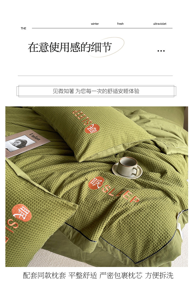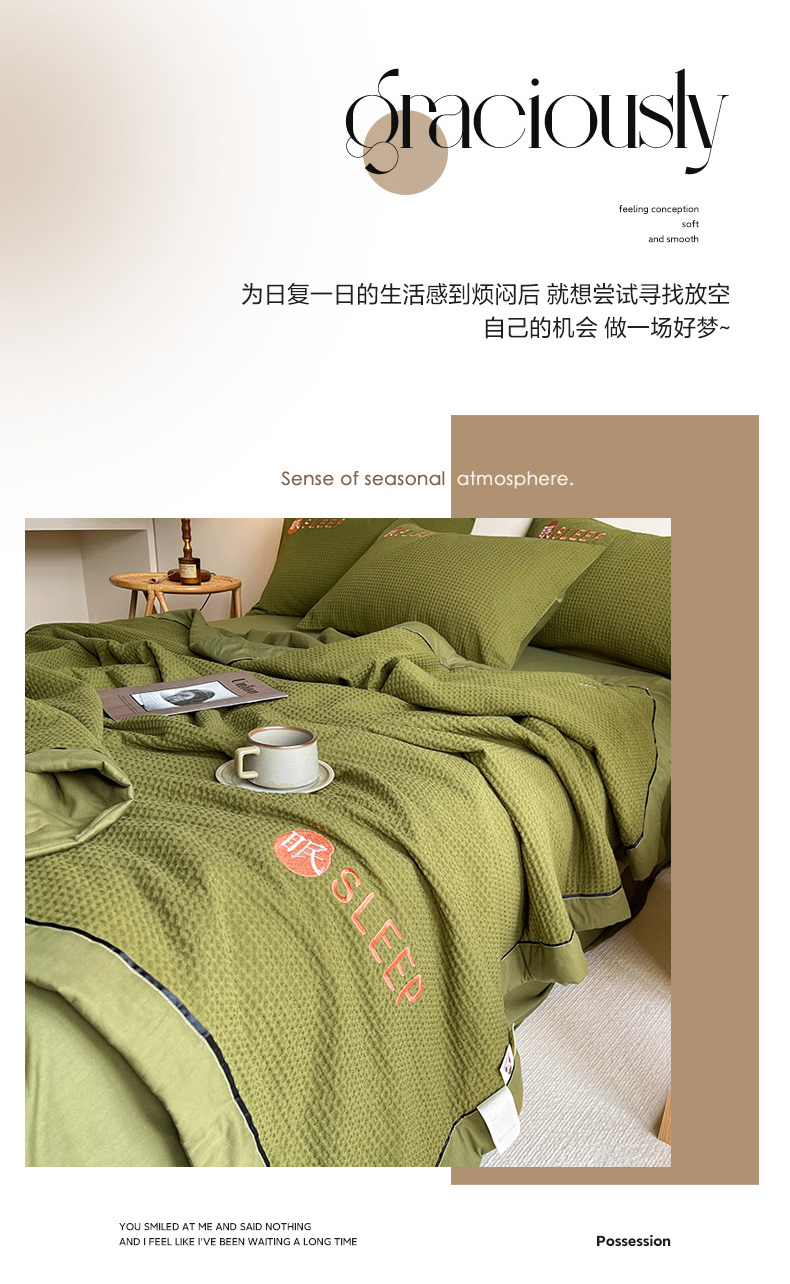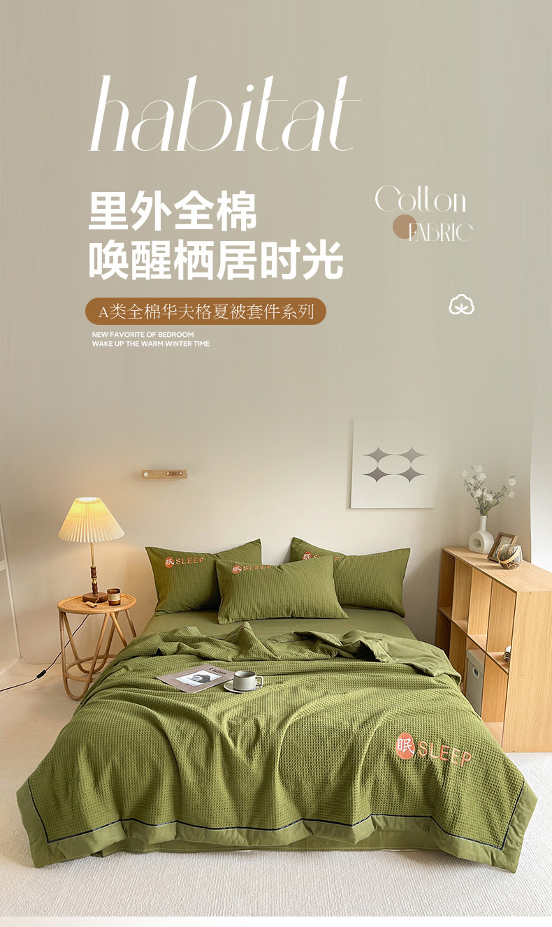 • 91家纺网 家纺一手货源 找家纺 眠博士 2024新款A类全棉华夫格拼角夏被套件系列 夏被-松绿