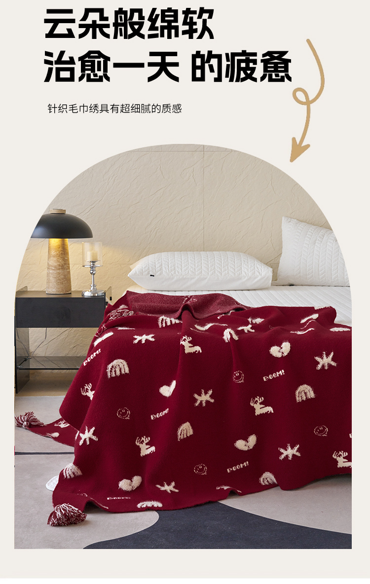 苏艺针织盖毯 2024龙年限定高克重一体针织毛巾绣亲肤毛毯盖毯 一鹿有你(红)