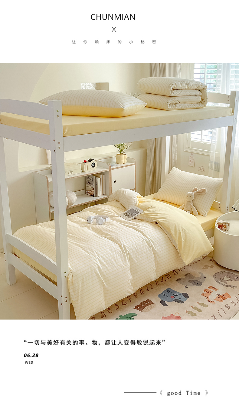 商品名称:Mr.pig猪先生水洗棉 2024新款A类小清新全棉四件套纯棉床单被套床笠学生宿舍三件套床床上用品 淡黄条