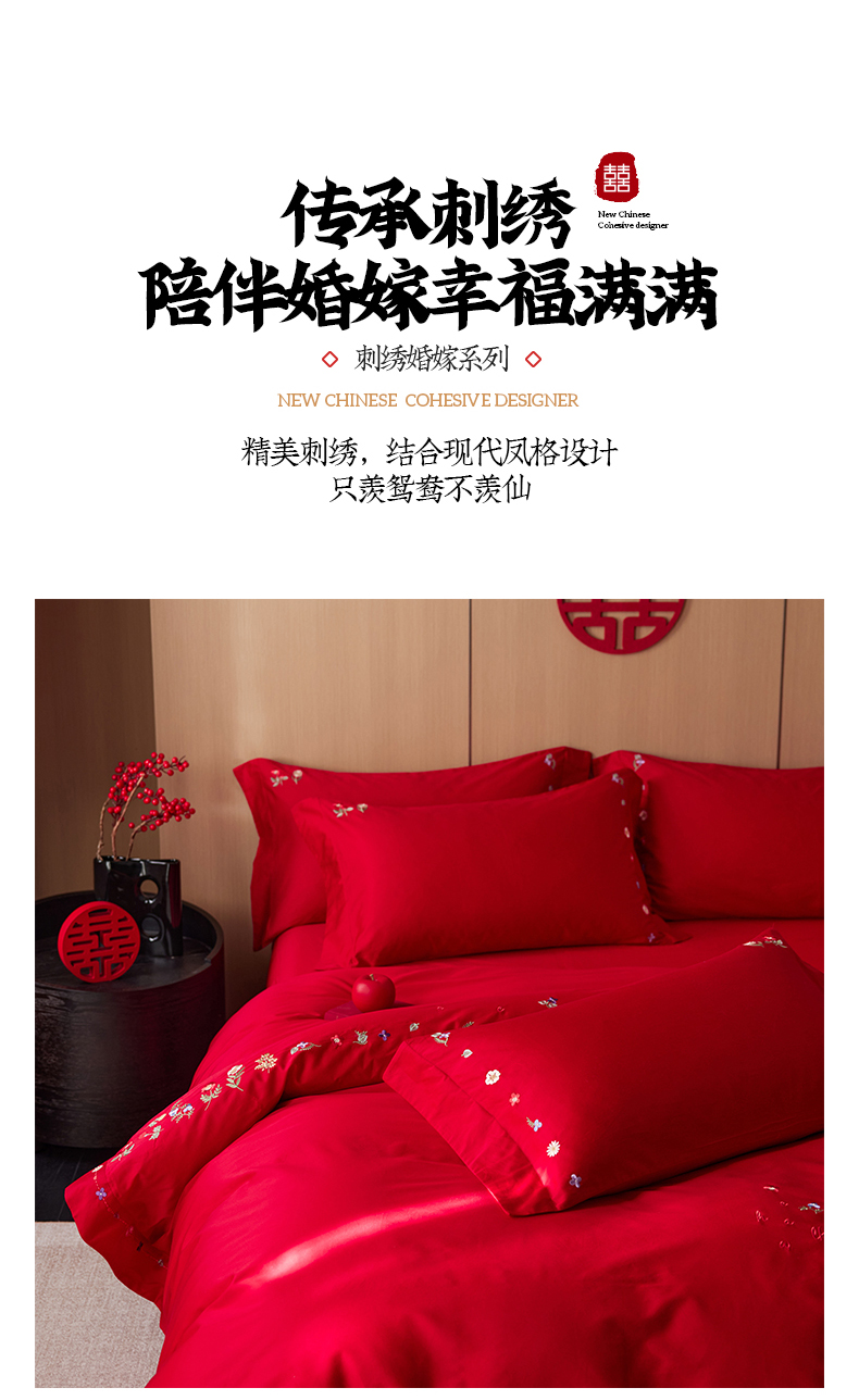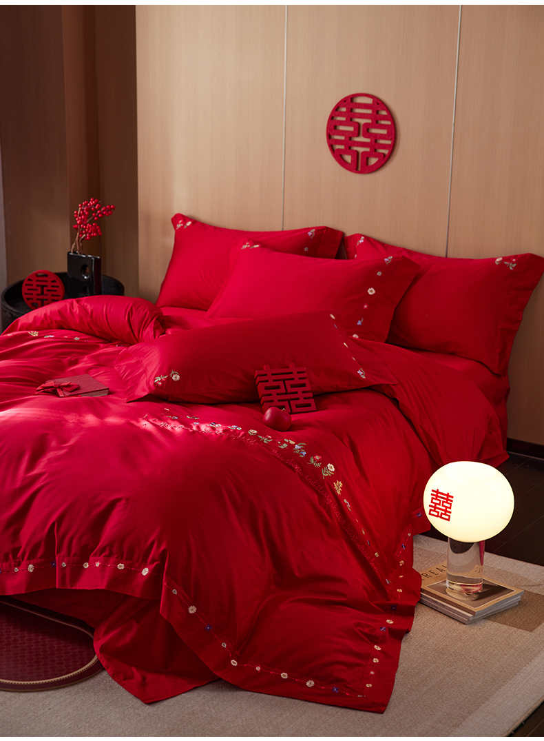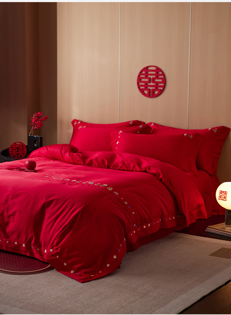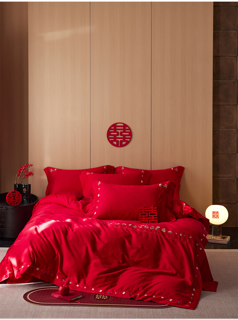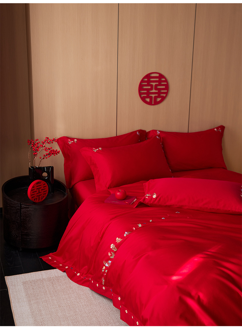 商品名称:简纯主义 2025新款100支长绒棉刺绣四件套花开并蒂系列 花开并蒂红