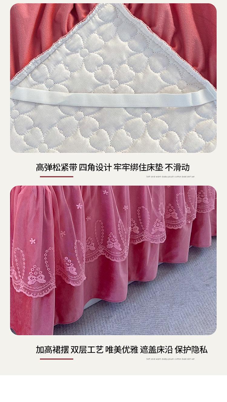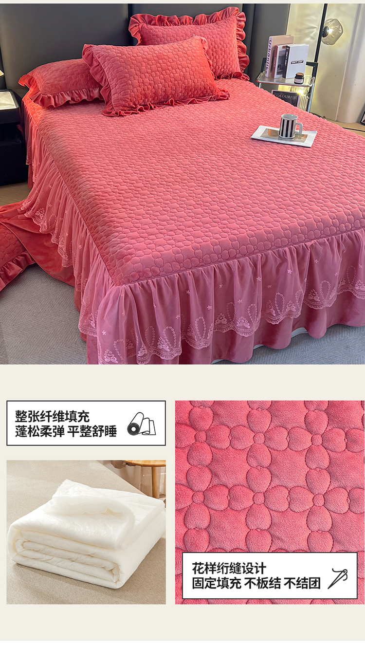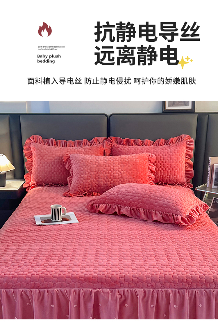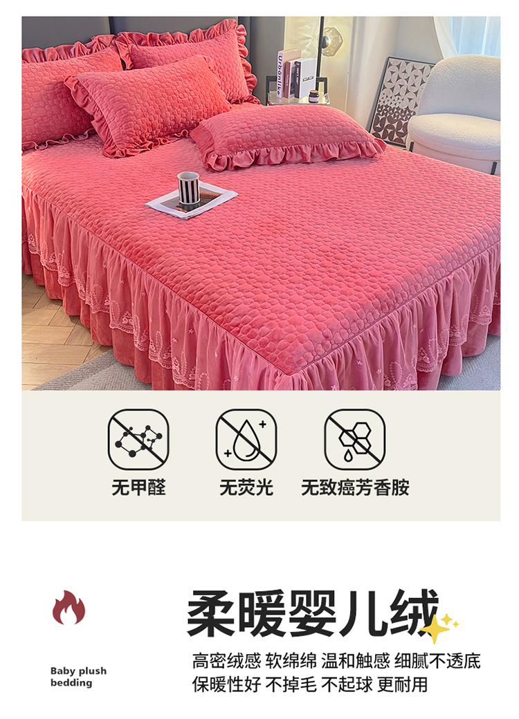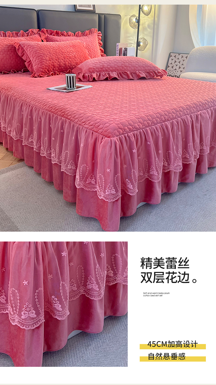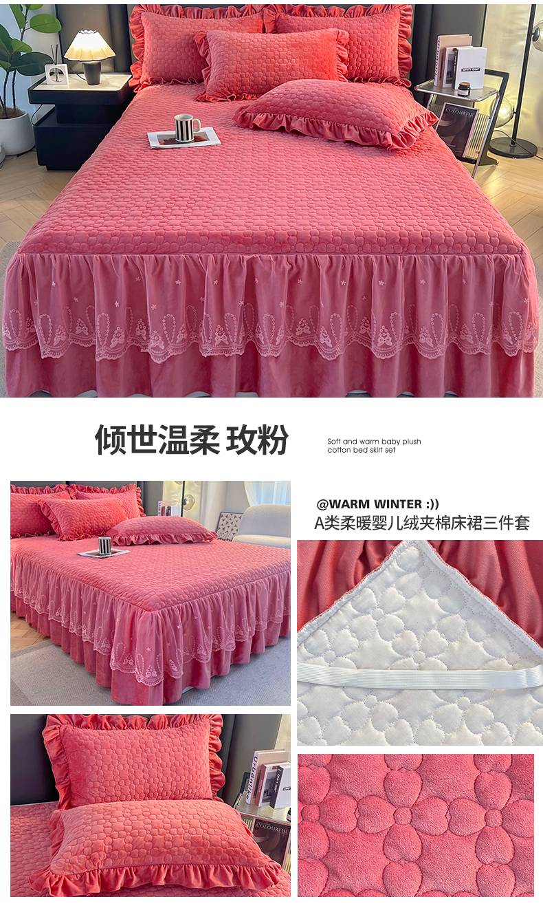 • 91家纺网 家纺一手货源 找家纺 2024新款A类柔暖婴儿绒夹棉床裙三件套-倾世温柔 倾世温柔 玫粉