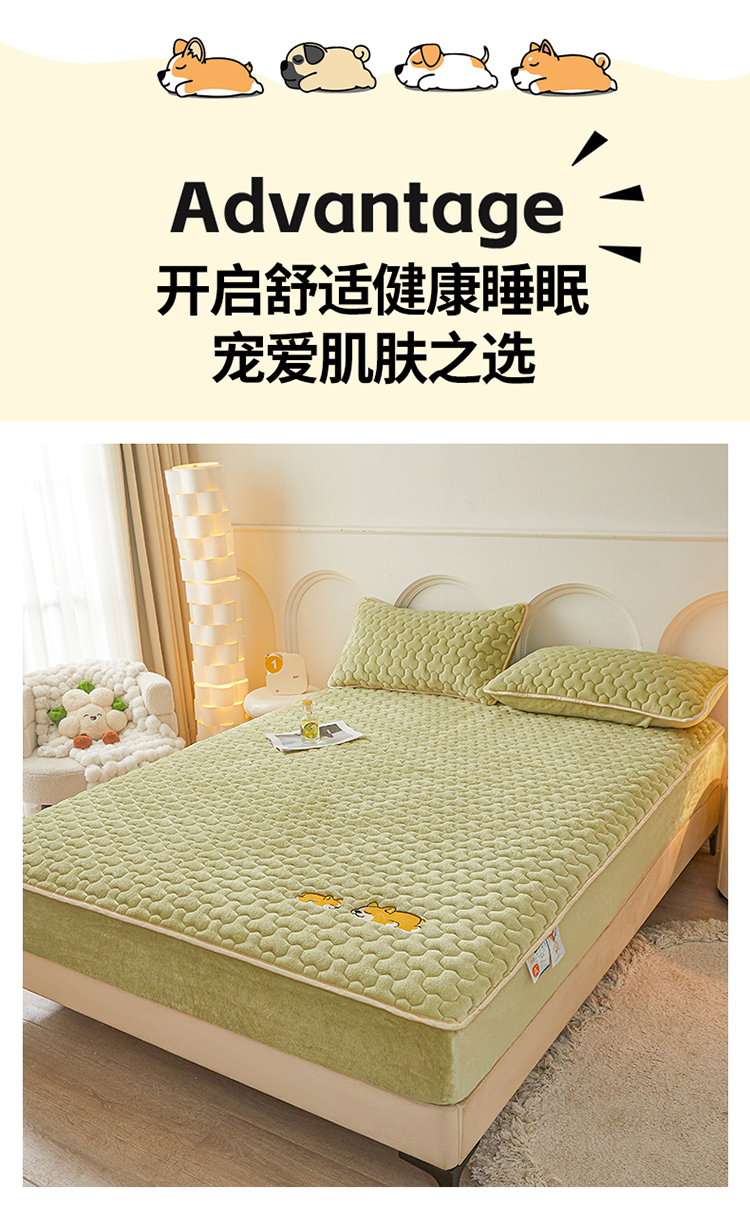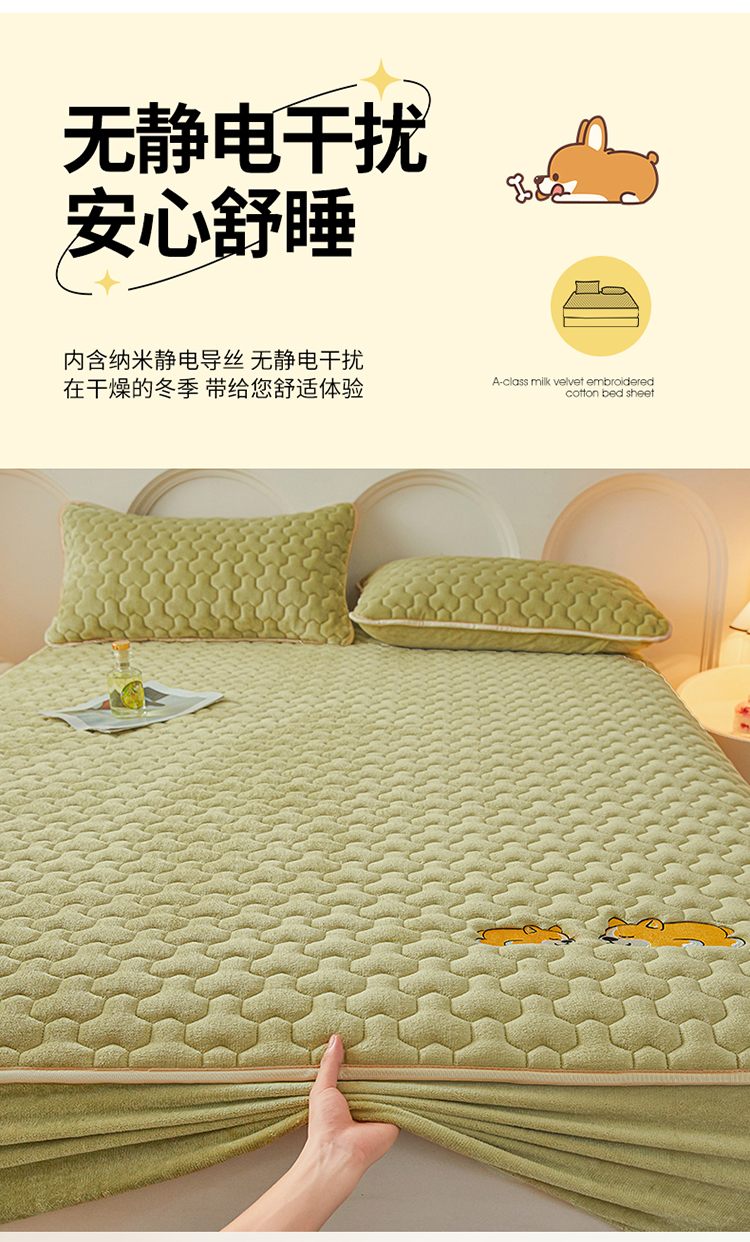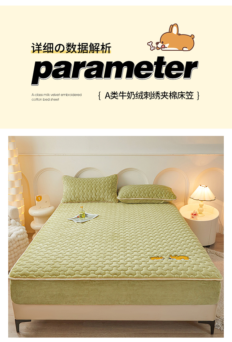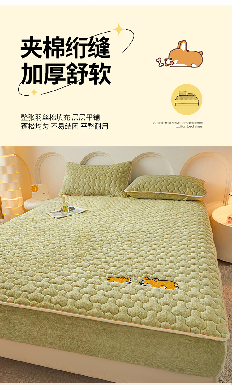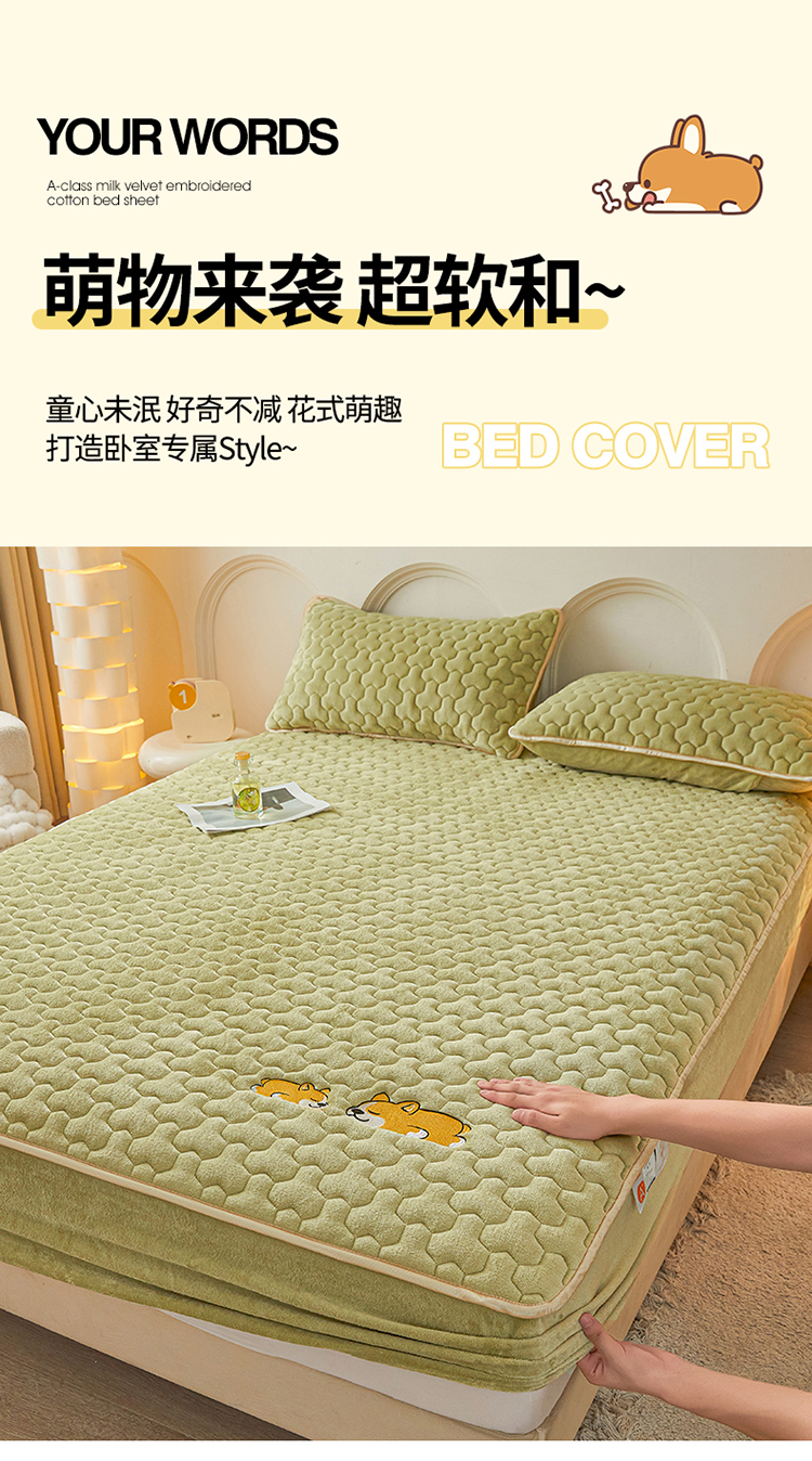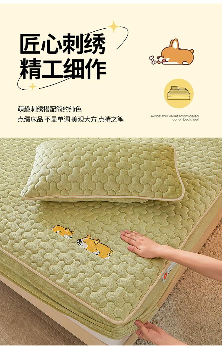 • 91家纺网 家纺一手货源 找家纺 2024新款A类牛奶绒刺绣夹棉床笠-小柯基 小柯基-果茶绿
